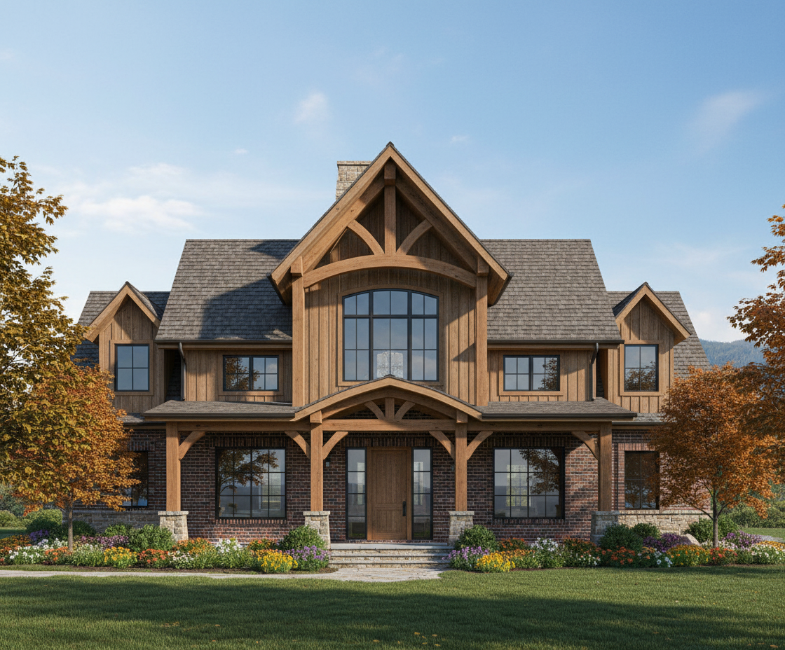 timber frame cabin arched beams inside gables single story floorplan 10ft ceilings minimum approx 1 5 stories tall front entry way recessed 8 2 two front flanking gables with arched beam accents