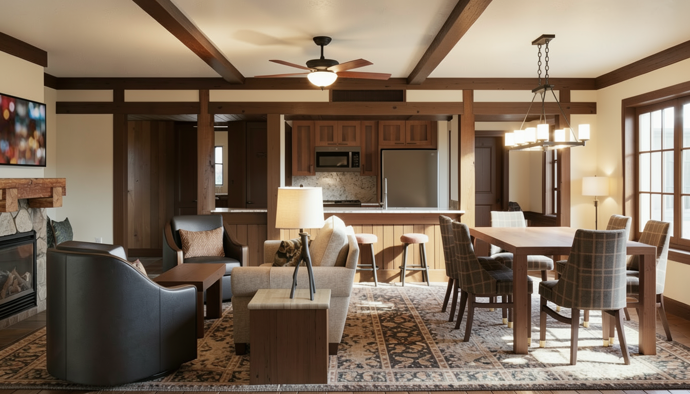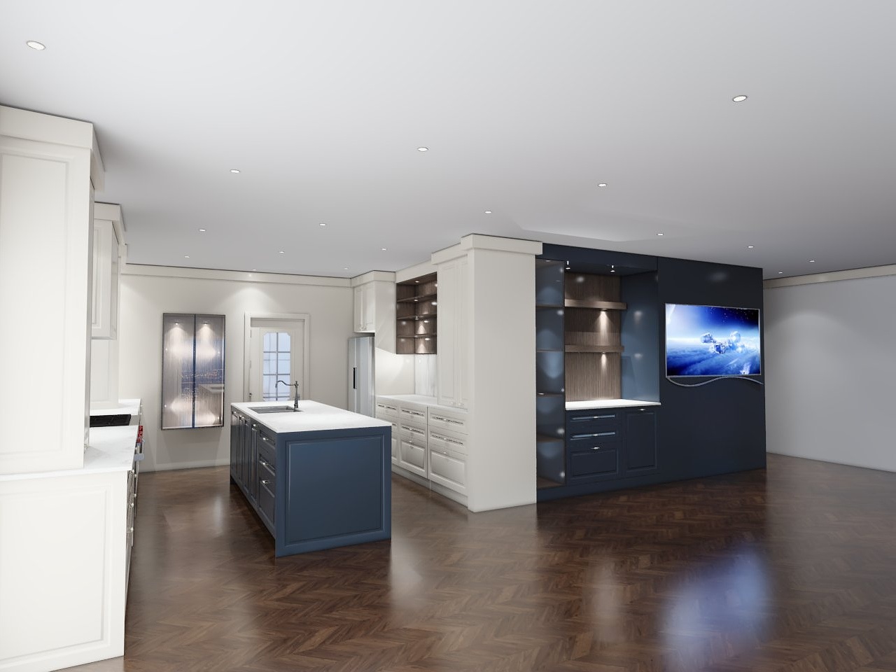 interior shot render a modern kitchen with a chic and elegant atmosphere use a combination of soft white for the cabinets and walls and introduce a deep navy blue for the central island and feature wall the countertops should have a pristine white marble finish enhance the ambience with warm soft lighting that gently illuminates the space the wooden floor should have a rich dark walnut tone adding depth and warmth to the room include a large tv screen displaying a serene cosmic scene in cool blue hues the overall mood should be contemporary luxurious and inviting