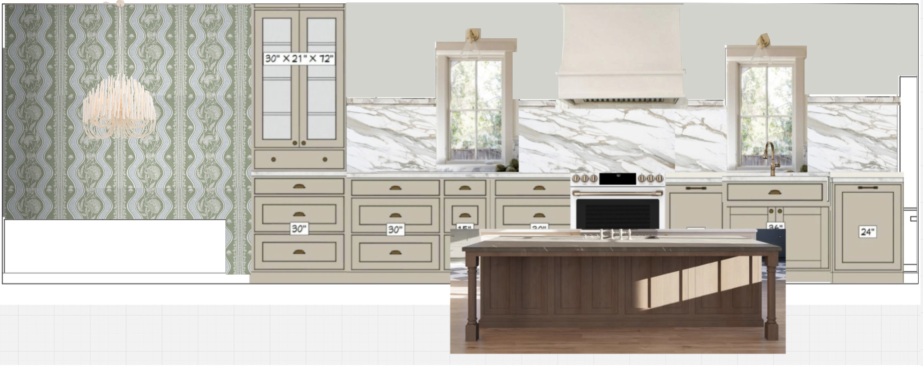 make this look like a rendering add a soft banquette on the left with a round white table and a refrigerator on the right side of view