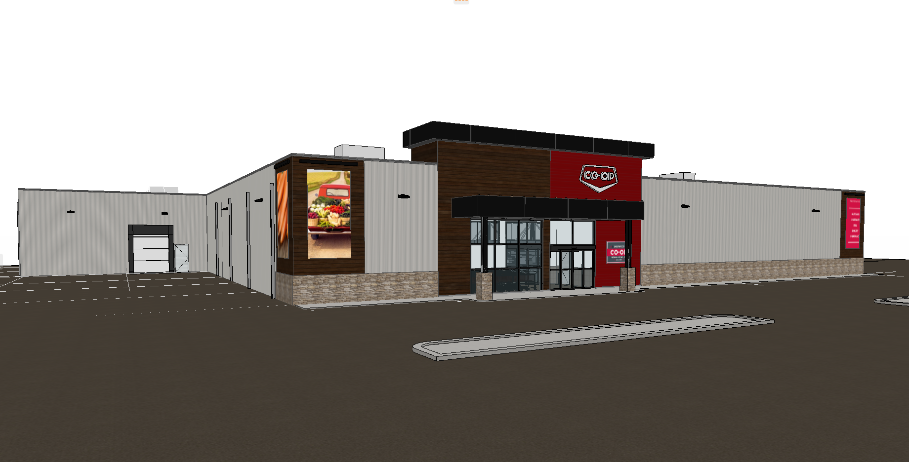 morning sunlight with light on the building face cars parking the the parking lot foggy background vertical light grey metal siding charcoal coloured stone on the bottom face