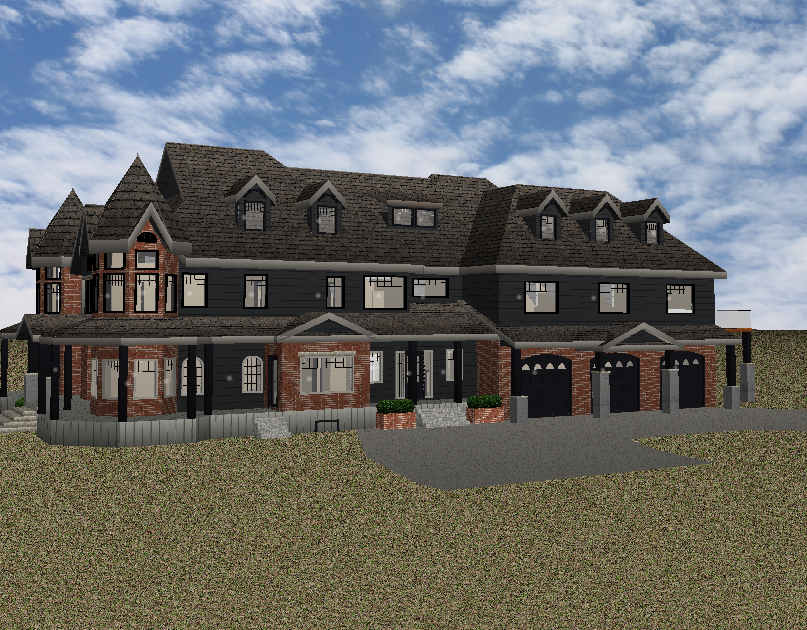 victorian style mansion with intricate architectural details dark charcoal walls and rich black brick accents the roof is a slate grey color with elegant peaks and gables surrounding the house is a lush green lawn and neatly trimmed shrubs the sky is a bright clear blue with soft fluffy white clouds the atmosphere is serene and inviting with a gently bubbling stone fountain in front of the house the small garage in the background matches the house s color scheme emphasize warm sunlight casting gentle shadows for a picturesque afternoon scene
