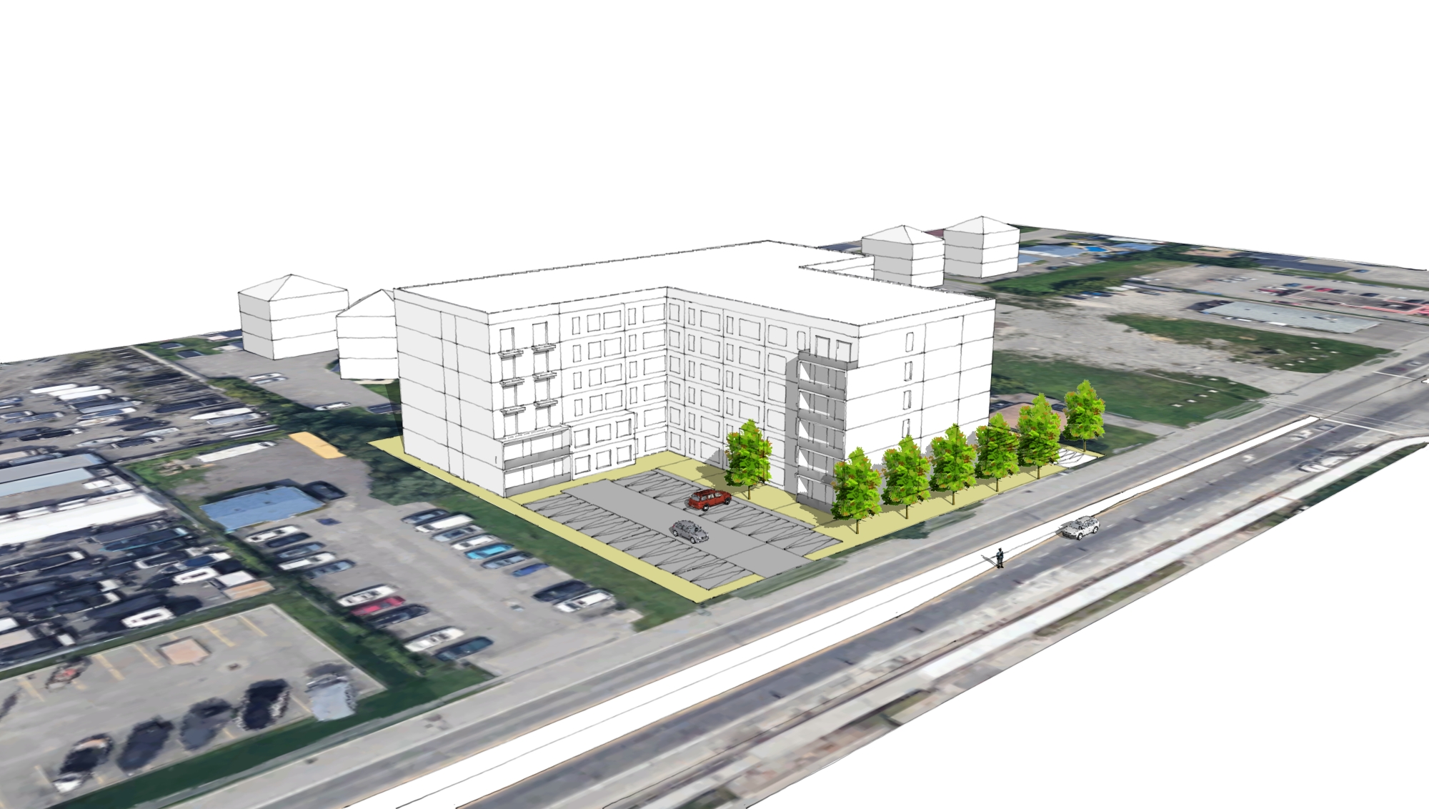 render this residential building keep same geiometry populate with trees and cars architectural visualization