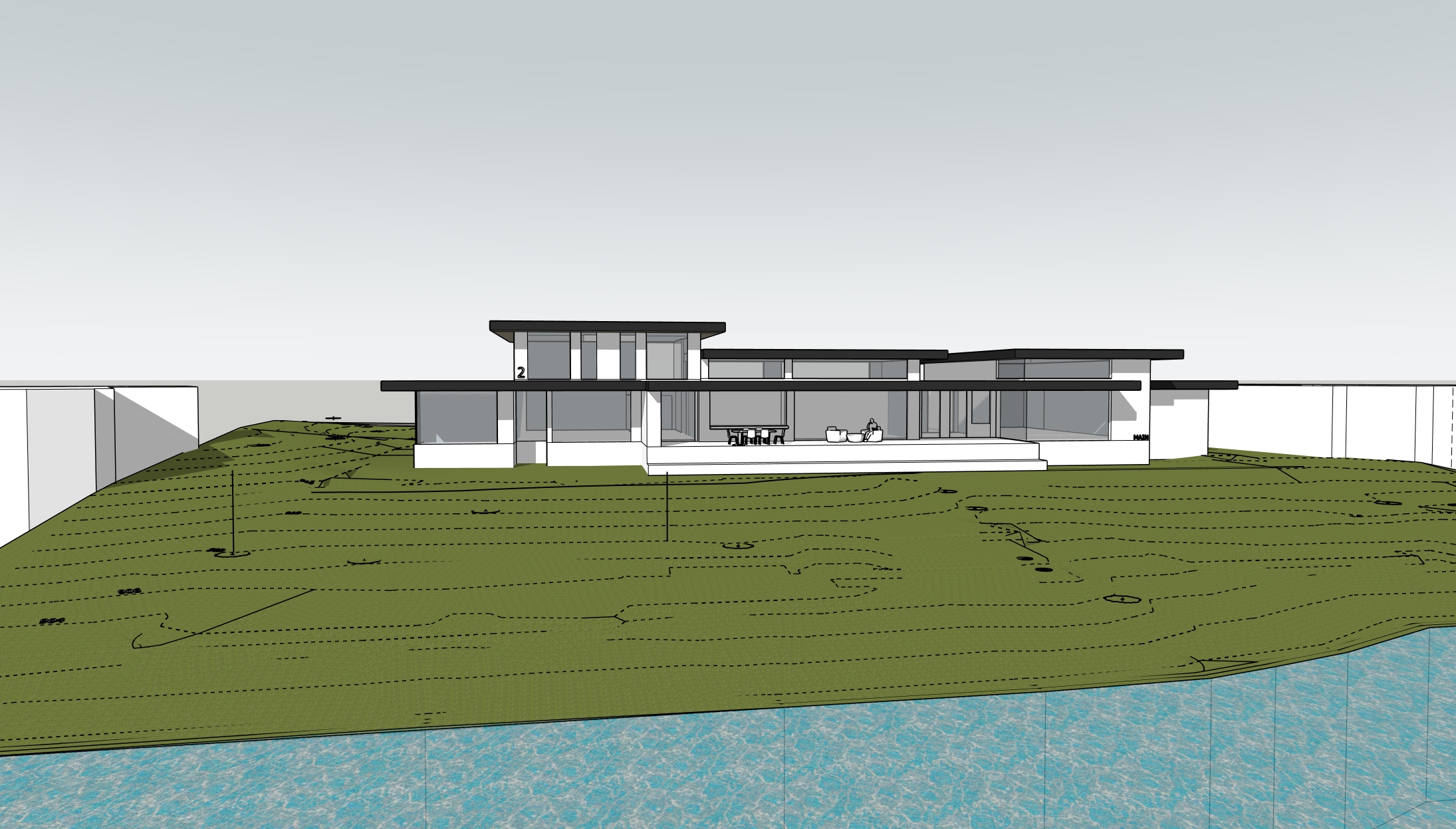 photorealistic rendering of modern home with mix of stone concrete dark steel wood ceilings stone floors