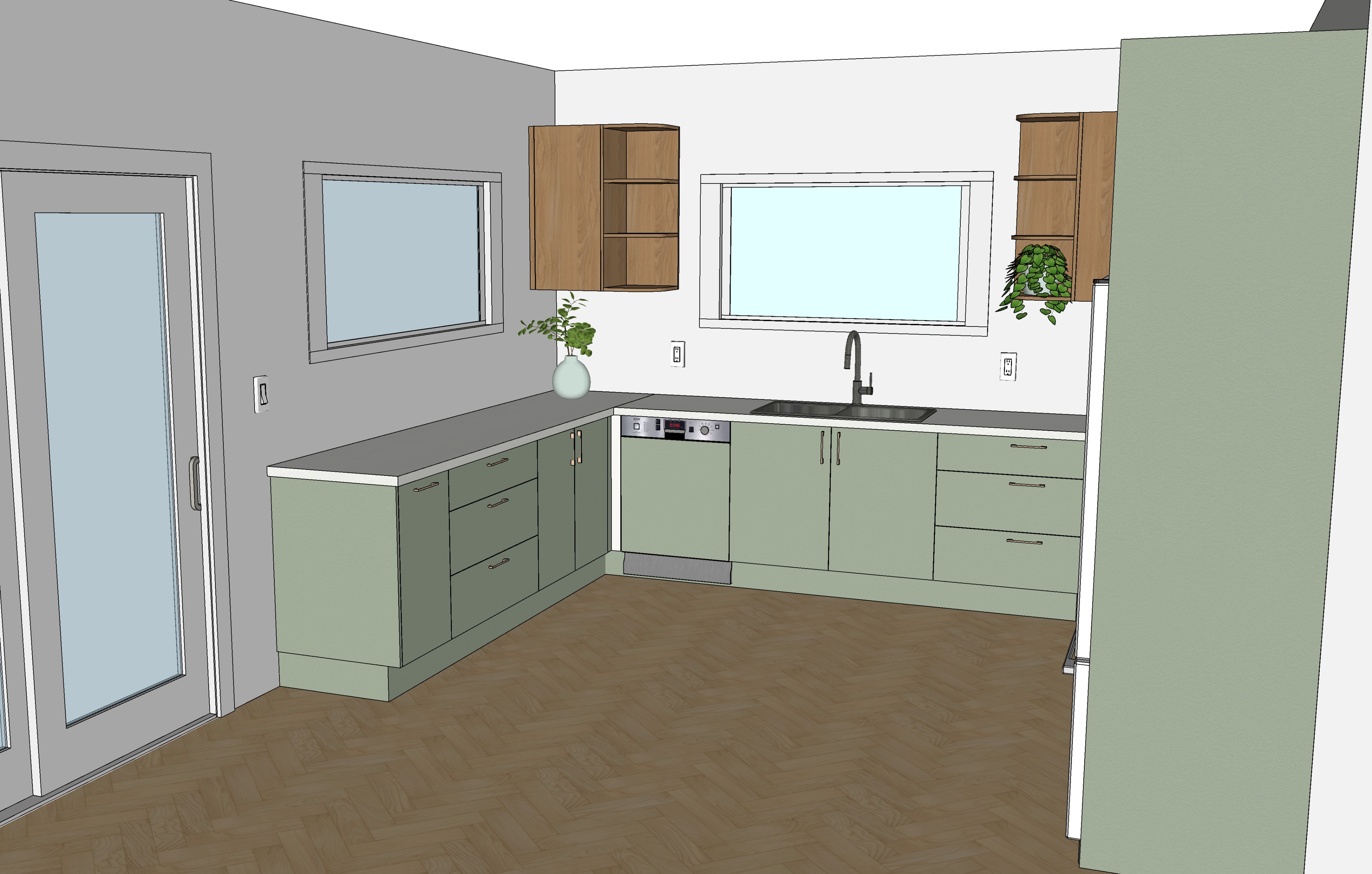 make the view out the windows a grass mountain in the distance the bench top is white stone add book and other beautiful things to the shelves