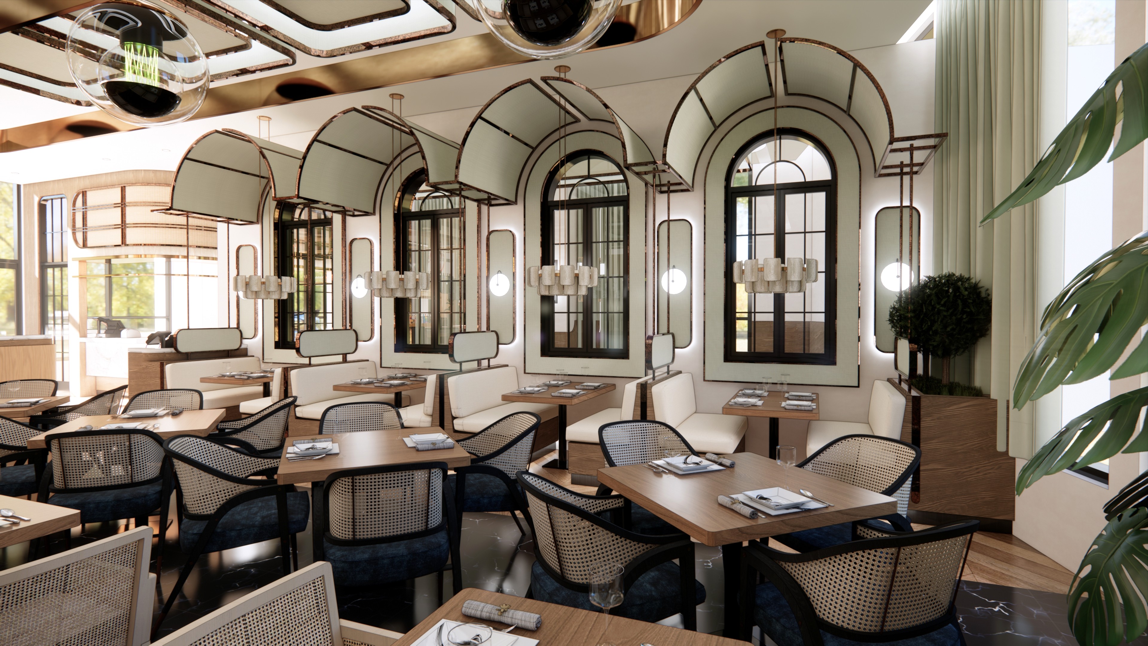 transform the provided restaurant interior image into a high end photorealistic render with warm golden hour atmosphere soft glowing highlights and relaxed upscale coastal energy while keeping everything exactly the same proportions same bar shape same booth seating same ceiling curves same wall finishes same curtains same materials and same spatial configuration do not move or alter any objects geometry