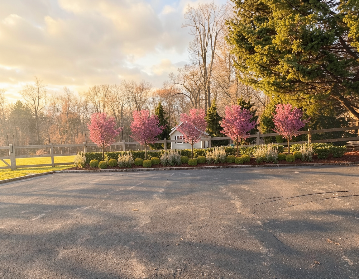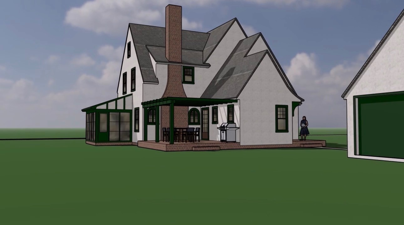 addition option in the backyard stucco home and garage green windows and trim backyard landscape for minneapolis area urban lot oak trees line the street beyond stucco garage with green doors and trim