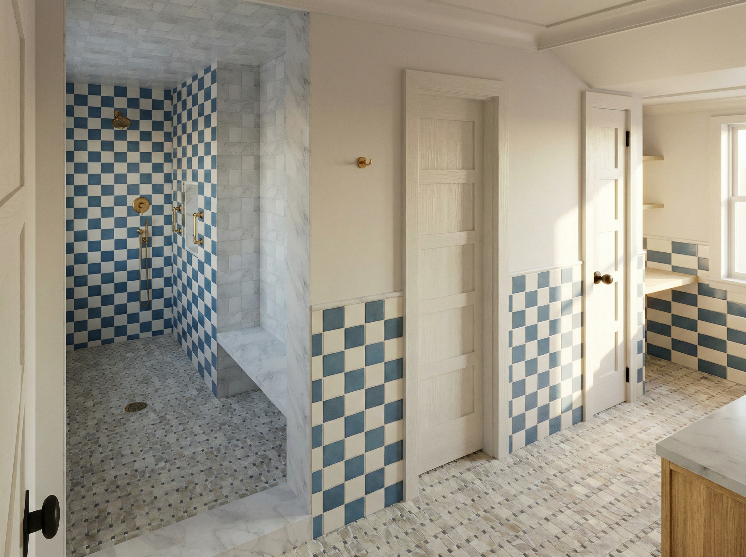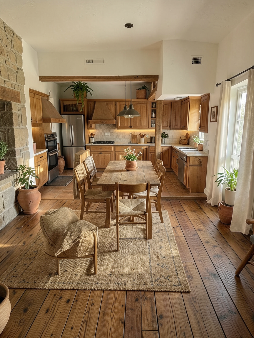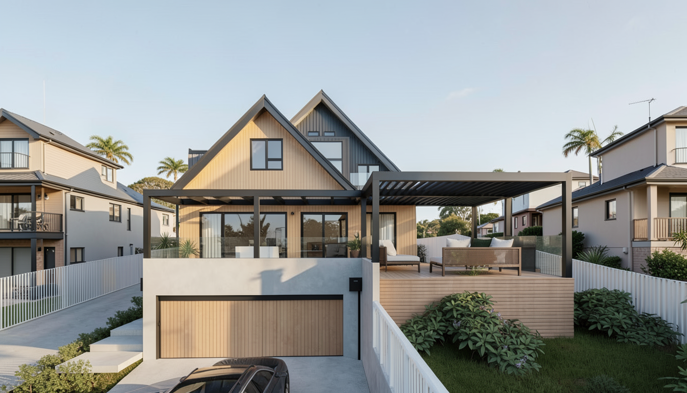 create a photorealistic rendering of the attached sketchup image maintain geometry proportions and locations of materials front porch is an off white tumbled brick with fiber cement siding on the sides the context is a narrow urban infill lot with a concrete strip driveway down the right side the house to be surrounded by low landscaping assume a relatively flat lot similar sized houses are located on the adjacent lots to the left and right time of this rendering should be late afternoon golden hour