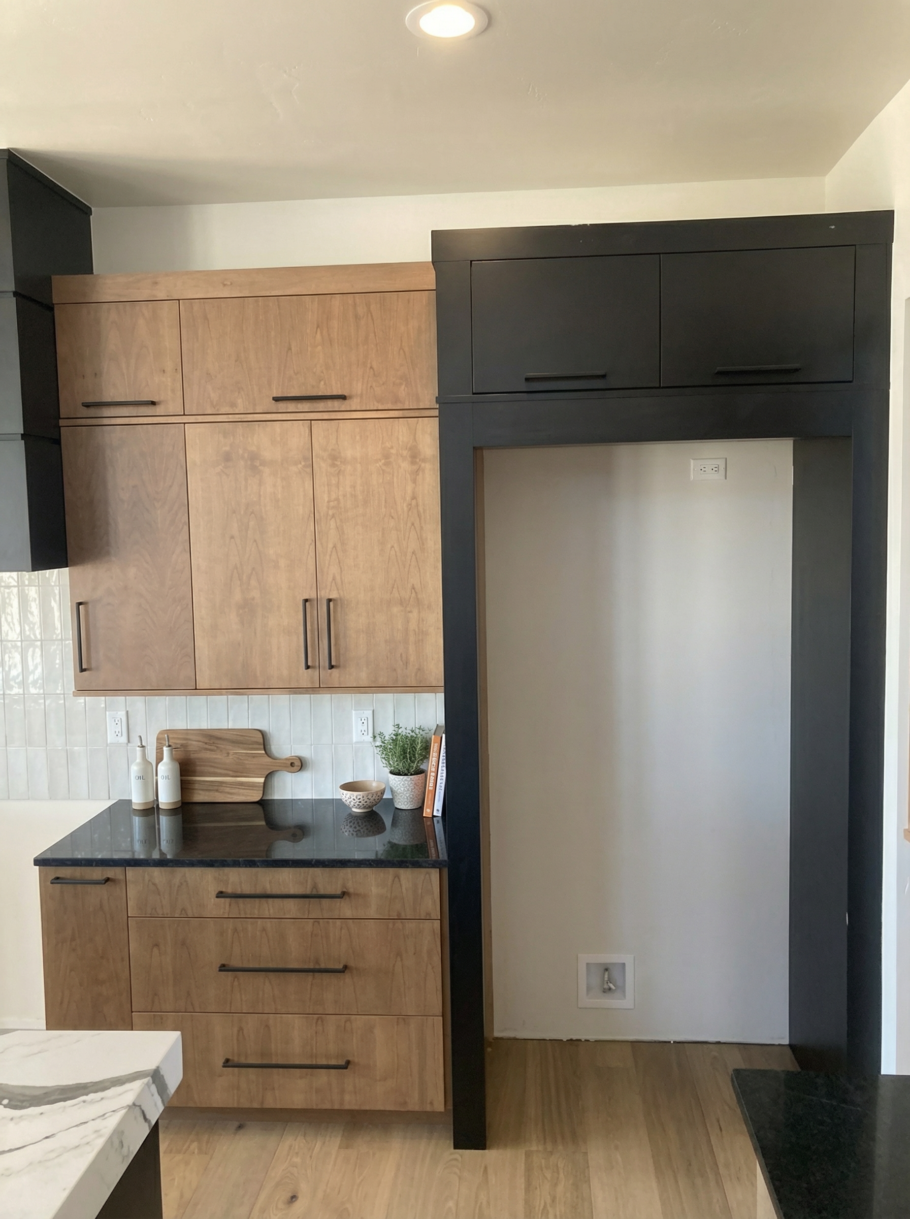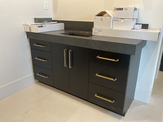 do not change the cabinets in any way preserve the exact cabinet colors materials finishes dimensions door and drawer styles hardware spacing alignment and all geometry exactly as shown do not alter the countertop shape backsplash appliances flooring lighting fixtures or wall structure only remove the construction materials clutter and mess from the scene clean the room and make it look finished and staged add a few simple tasteful home accessories appropriate for the style of the space but do not add or remove any furniture windows or architectural elements maintain the original lighting direction and realism enhance clarity and polish the photo while keeping the cabinetry and room design completely unchanged do not alter the lighting to keep the cabinet colors as they are in the image stage for a modern bathroom