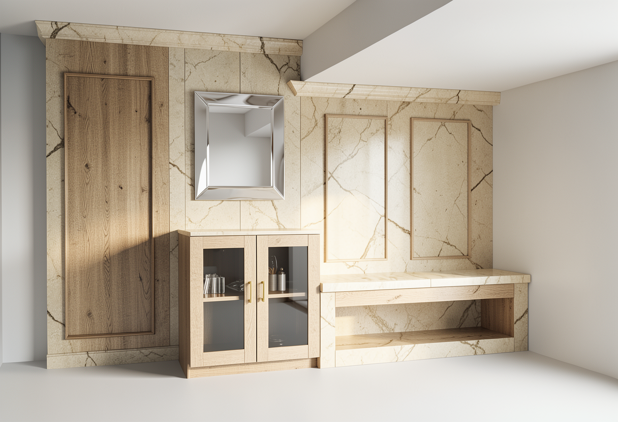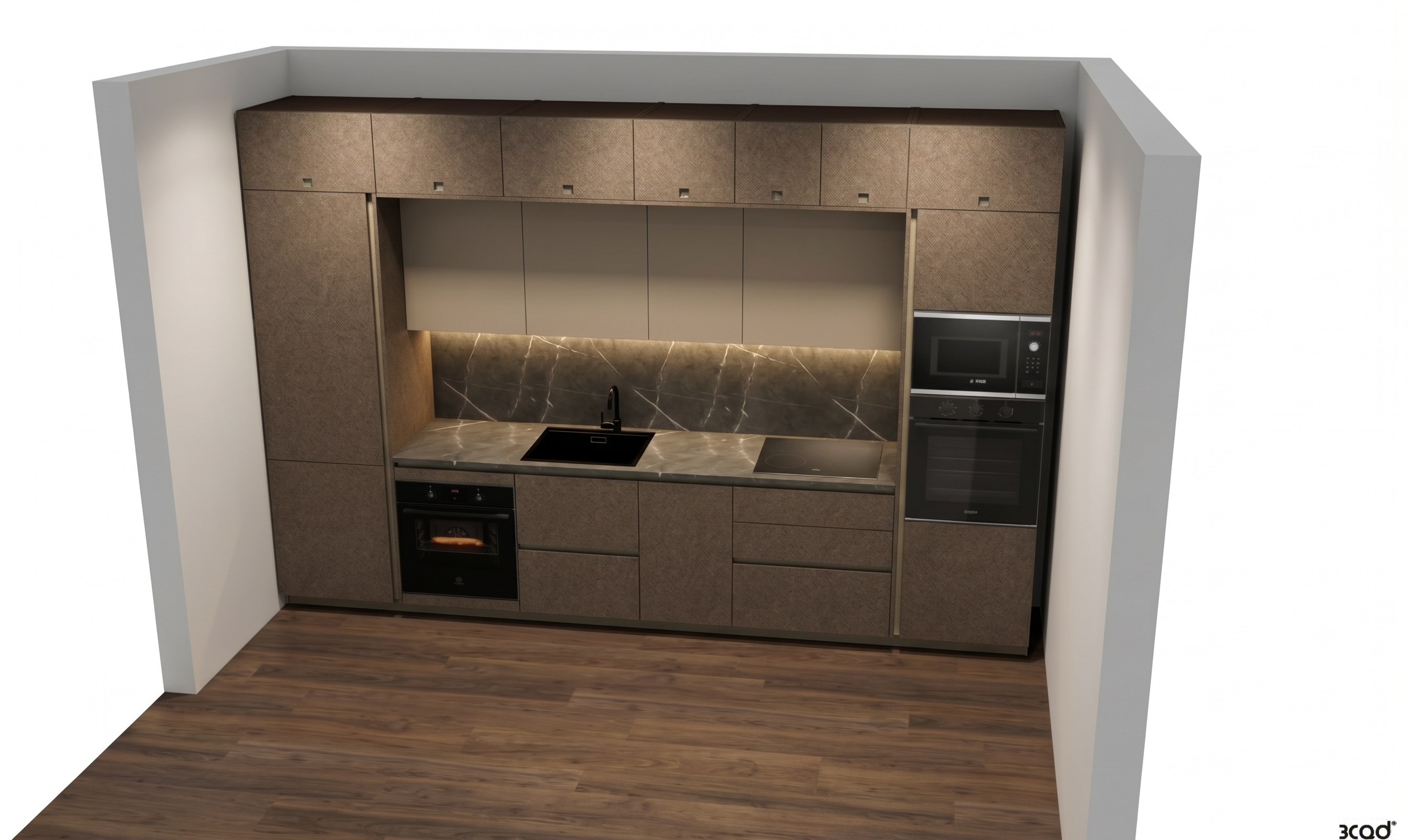 render a photorealistic modern kitchen interior with a cozy and inviting atmosphere features wooden cabinets in a dark gray with warm undertones with satin nickel cabinet hardware with a 3x12 artic white picket undulated tile backsplash with snow white grout and countertops highlight the sleek stainless appliances and countertop to be dawn mist granite stainless steel undermount double bowl sink with a delta westville single handle pull down kitchen faucet in artic stainless walls in a soft grey e0e2e0 ceiling in a white f7f7f1 base board in a white f7f7f1 show molding in a white f7f7f1 doors in a white f7f7f1 door hardware to be a satin nickel add floor elmwood smoke lvt in a soft cool gray brown cast and a more weathered look than the warmer oak visuals add three one light pendants with a slender design that complements mid century modern transitional and contemporary settings with a simple round canopy suspended over a cylindrical glass shade over the island in matte black use a warm ambient lighting in the can lights show use a soft ambient lighting to enhance the warm atmosphere color scheme