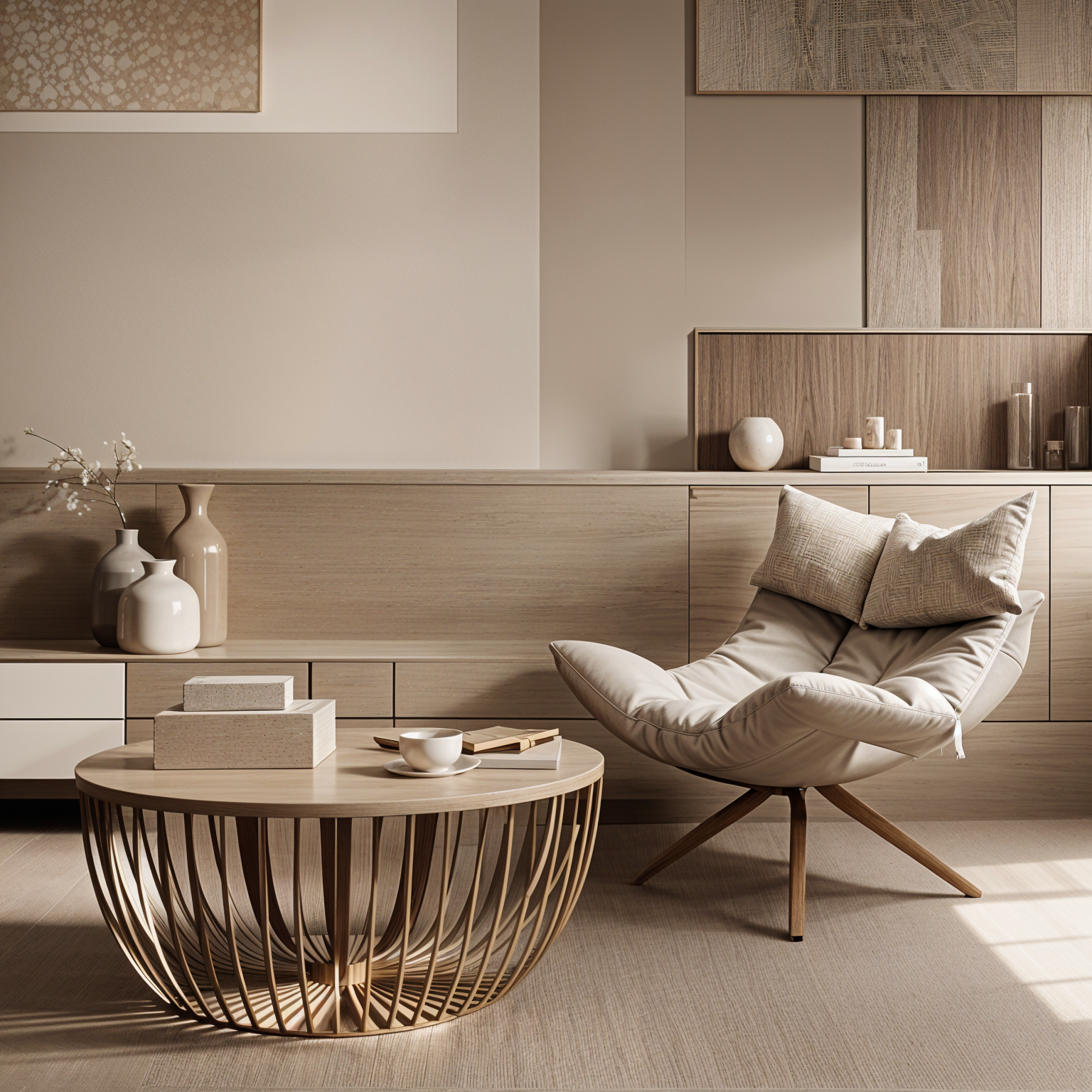 interior shot a spacious modern waiting area with minimalist design the ceiling is a soft taupe providing a warm and inviting atmosphere the walls are a light cream complementing the taupe ceiling the seating consists of sleek angular couches in a light camel brown leather giving a chic contrast floor to ceiling glass walls allow for ample natural light subtly reflecting off the polished concrete floor in a muted sand color potted plants in deep green are scattered throughout adding a touch of nature and vibrancy the background reveals an open door made of light wood enhancing the earthy tones of the space the overall atmosphere is calm modern and inviting with a focus on neutral tones and natural light
