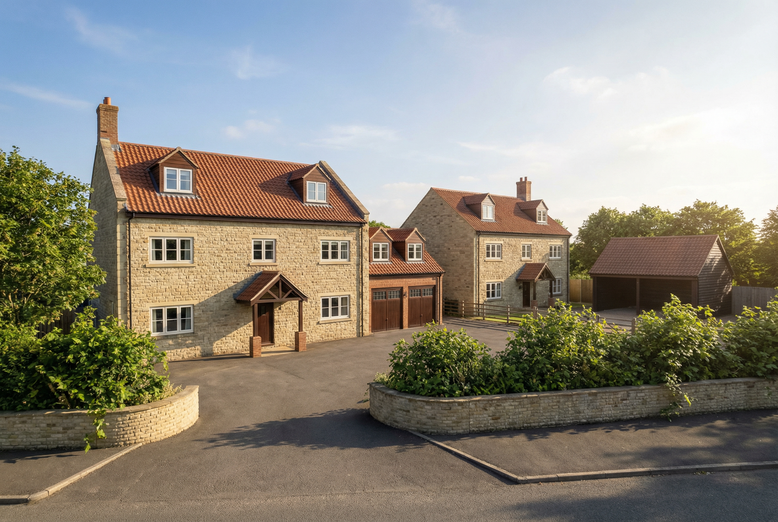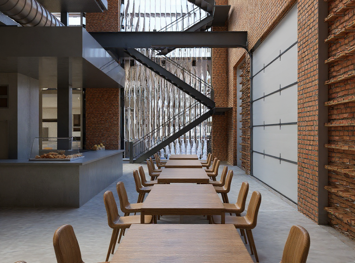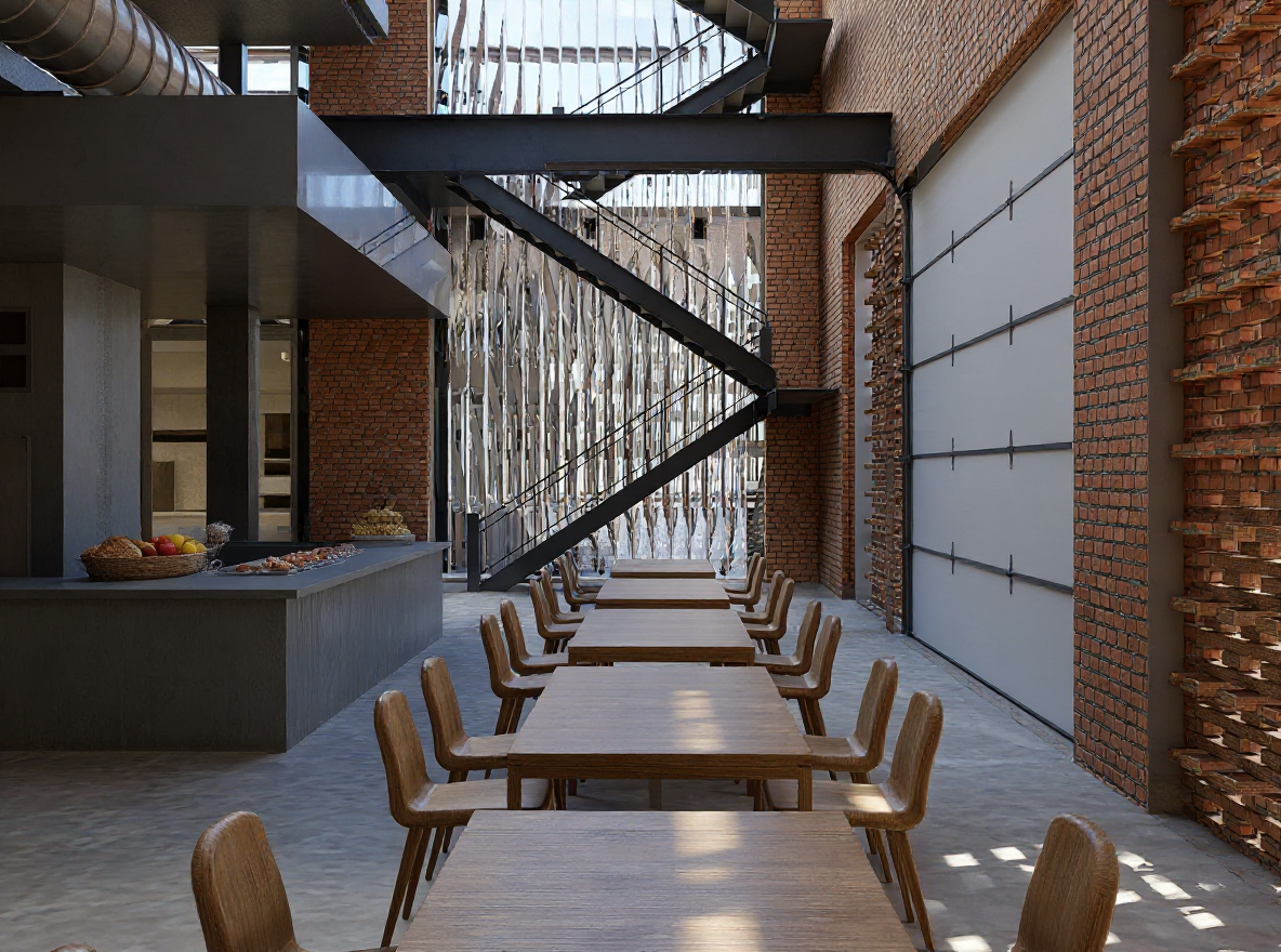 make realistic the glass connecting the two brick buildings is a greenhouse and has crops there are two trees in front of the brick screen to the right the first floor below the greenhouse is a market no people