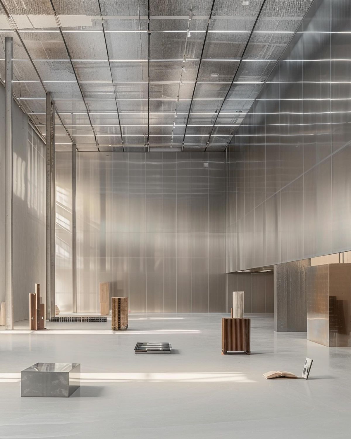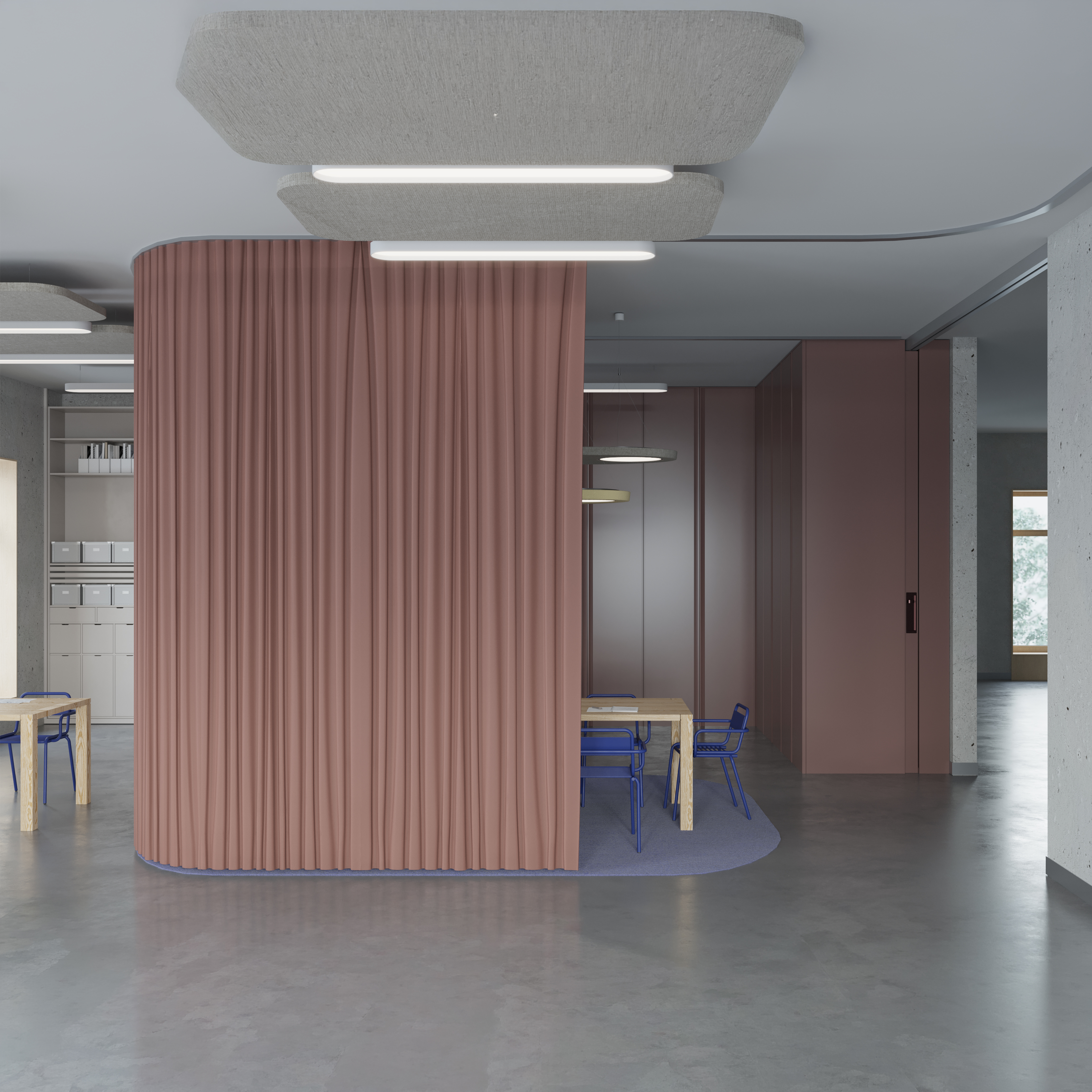 exterior shot create a modern interior environment with a calm inviting atmosphere feature a room with a pinkish brown curved wall paneling and drapery the flooring is a muted gray polished concrete providing a sleek and contemporary foundation incorporate light wood furniture including tables and shelves for a natural touch include vibrant blue chairs to add a pop of color and visual interest place these against the pinkish brown wall to create contrast use soft diffused lighting from ceiling fixtures for a cozy ambiance add subtle decorative elements such as muted tones in the background to enhance the modern aesthetic