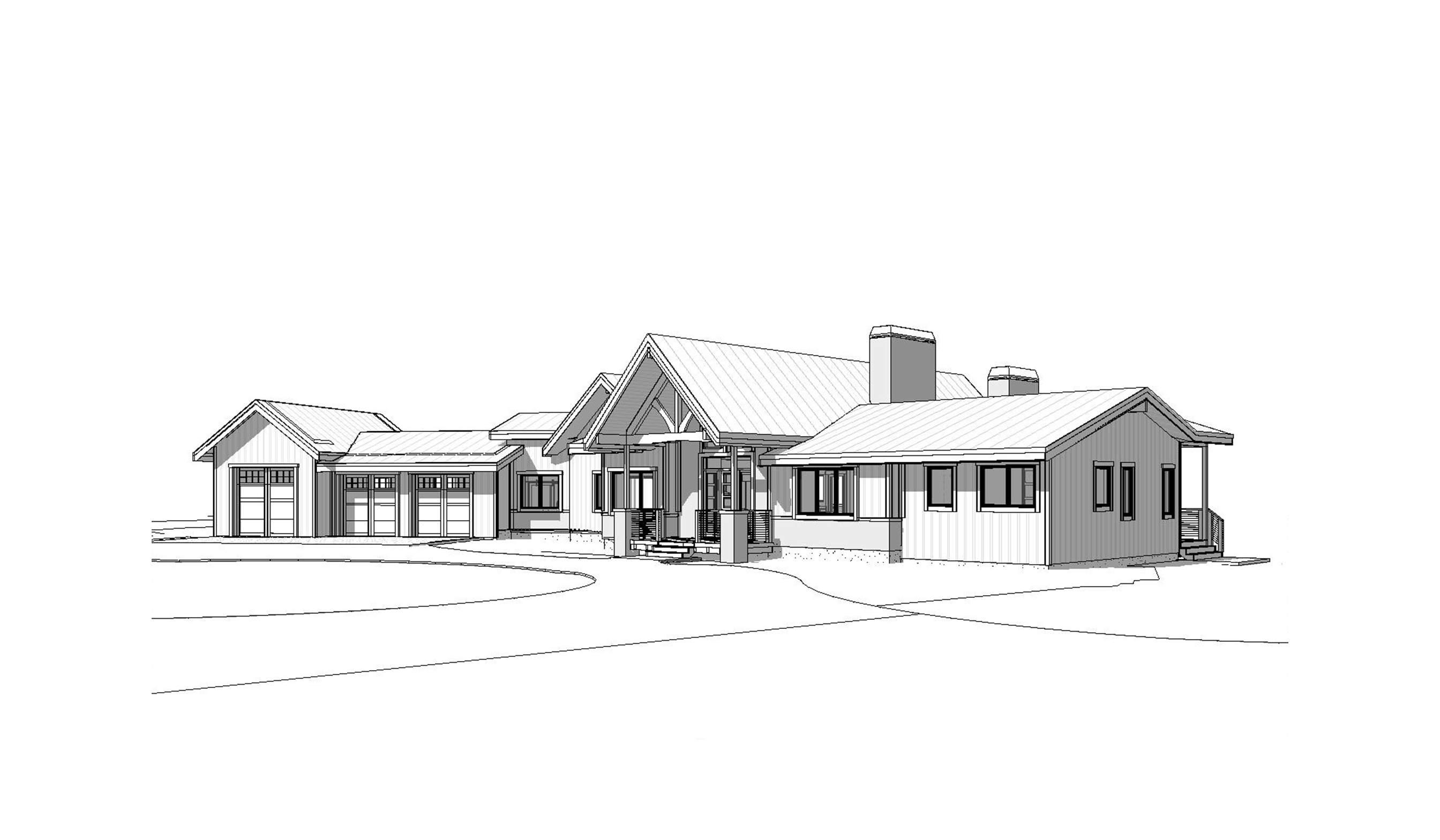 front view of a clean mountain modern architectural exterior rendered in cinematic vibrant dusk lighting with vibrant colorful skies heavy timber architectural style black vertical select grade cedar siding with warm wood accents manicured landscaping around structure with hedges black standing seam metal roof prominent cinematic mountains and douglas fir trees surrounding the house in the background high fidelity photorealistic visualization crisp shadow falloff refined facade geometry soft atmospheric depth premium architectural photography mood ultra clean composition and materials black window trim dark roof trim concrete driveway leading up to the garage doors photorealistic render