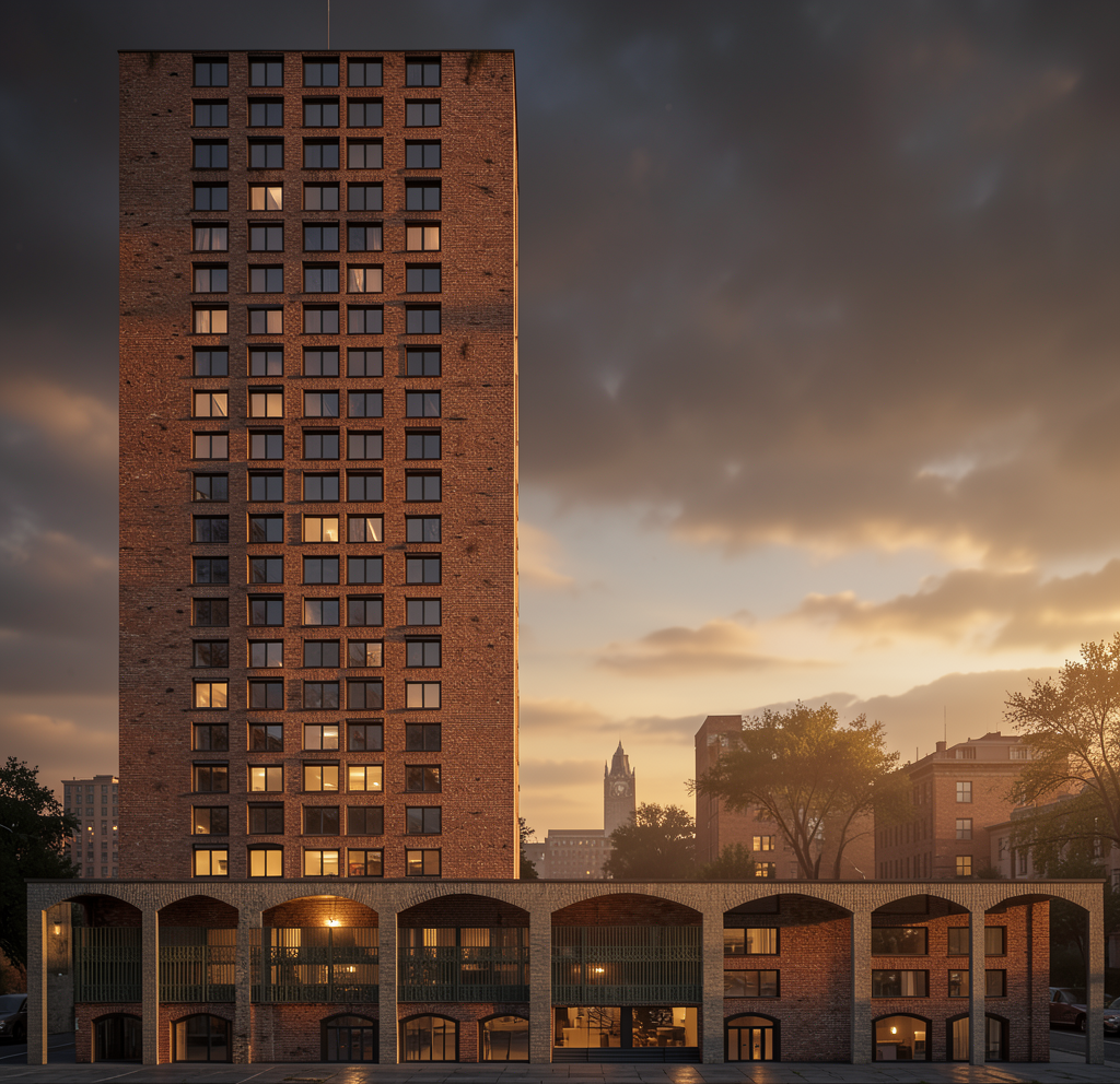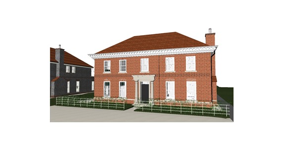 keep same angle of image generate a hyper realistic visual the house on the left is traditional flint with red brick detailing white windows and black fascia and soffits the entrance detail is lead and wrought iron the house on the right is red brick with back brick on edge detailing the dentals and white soffit and fascia as per the drawing the windows also white make the fence a black post and rail fence with a cream resin bound front driveway the planting is to look semi rural but manicured with some wild planting in the central grassed area make the image aspriational and classy and dont change design or proportions keep same view