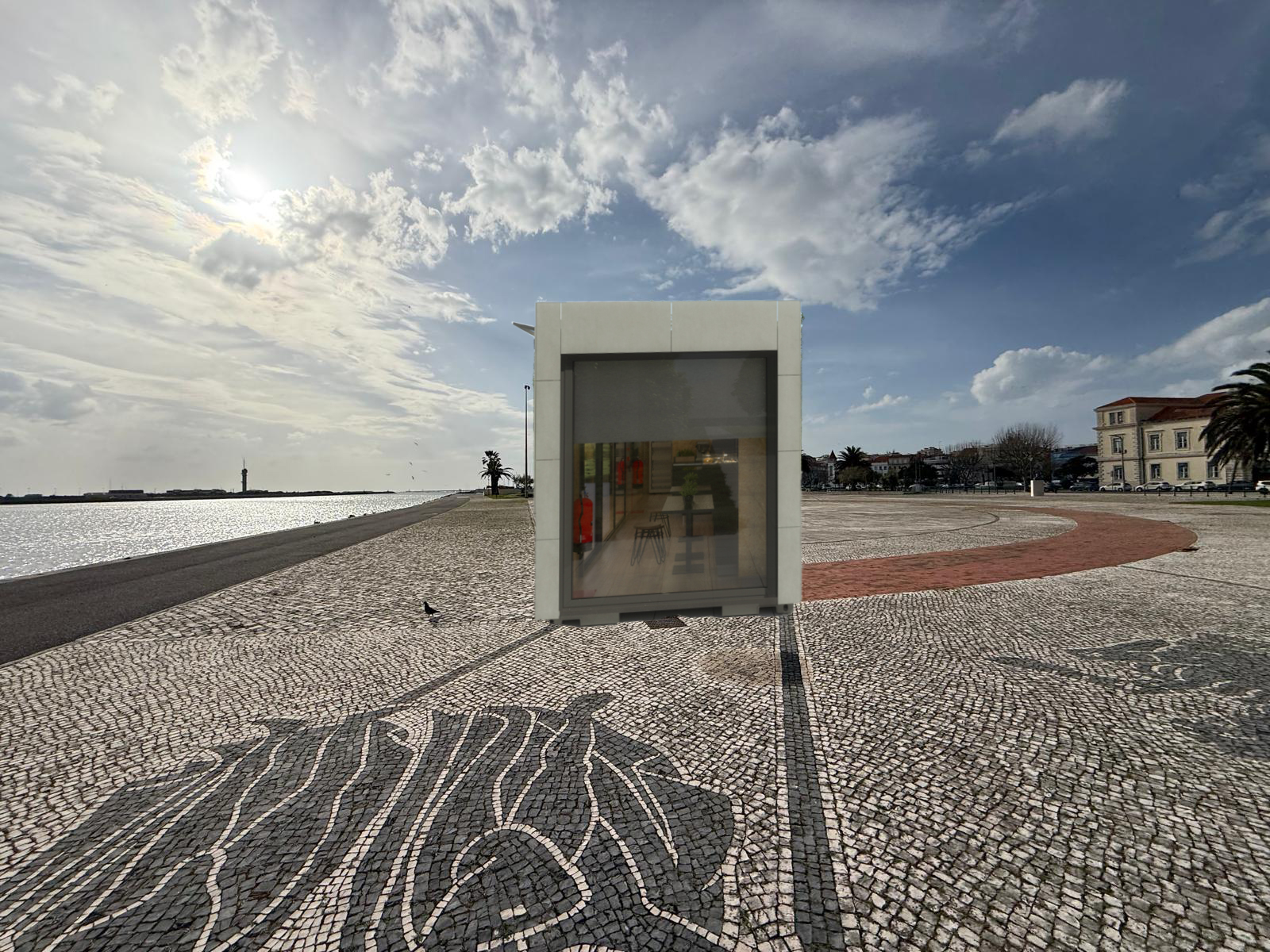 posiciona cadeiras e mesas de esplanada a frente do rio