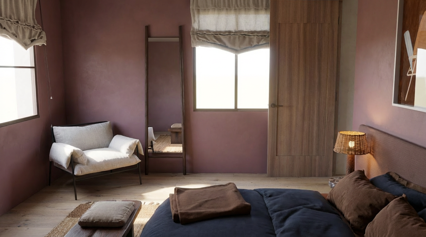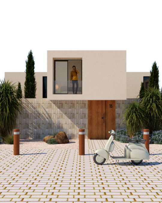 photorealistic editorial exterior render strictly preserving composition geometry and camera ground in beige cobblestone paving with no visible joints open gaps between pieces in a grey tone similar to the wall cladding wall finished with small format rectangular clay pieces in vertical disposition mediterranean style with natural texture and subtle tonal variation bollards in corten steel with a white semi opaque glass band lighting element entrance door in wood with a minimal frame clean and simple respecting the original design enhance vegetation more texture depth and subtle reflective quality on leaves natural variation garden areas in slightly whitish beige gravel with organic shape and subtle unevenness not flat improve the person on the balcony more defined realistic face and proportions well integrated lighting adjust vespa to an ochre color with more presence maintaining realistic materials add clear mediterranean blue sky and natural mountain background editorial design atmosphere carefully crafted textures poetic material expression lighting with defined shadows and a very subtle light flare from the left soft and controlled not overpowering the image very high realism accurate materials subtle imperfections balanced light no plastic look