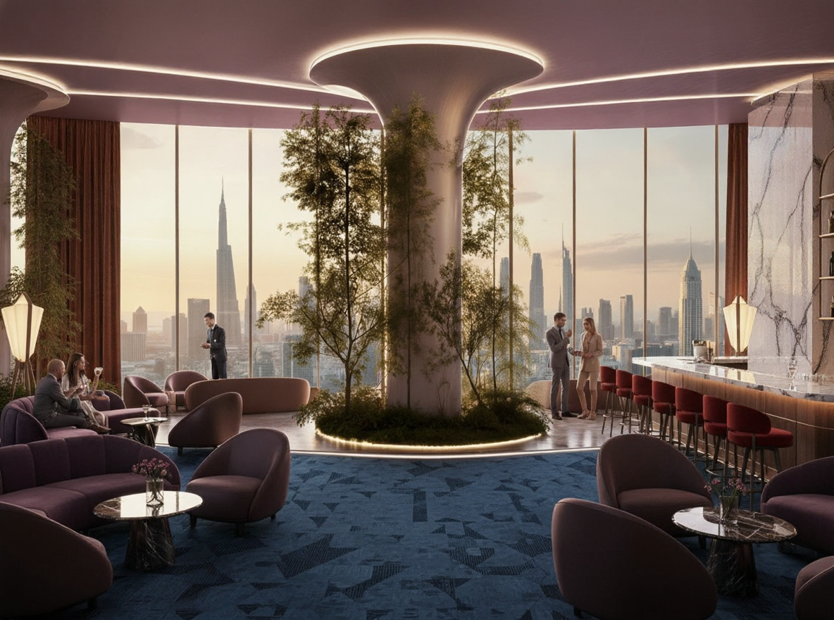 luxurious futuristic sky lounge belonging to an elite arts club like a negroni lounge with cool sculptures maintain 16 9 aspect ratio