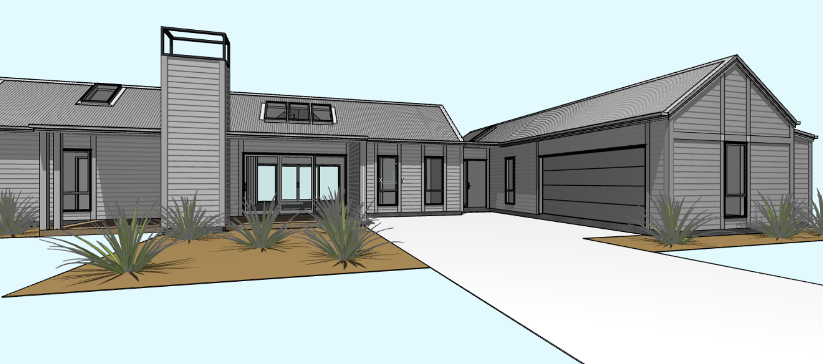 black metal roof dark grey shiplap cladding black window frames extensive native planting lawns sunset interior lights on
