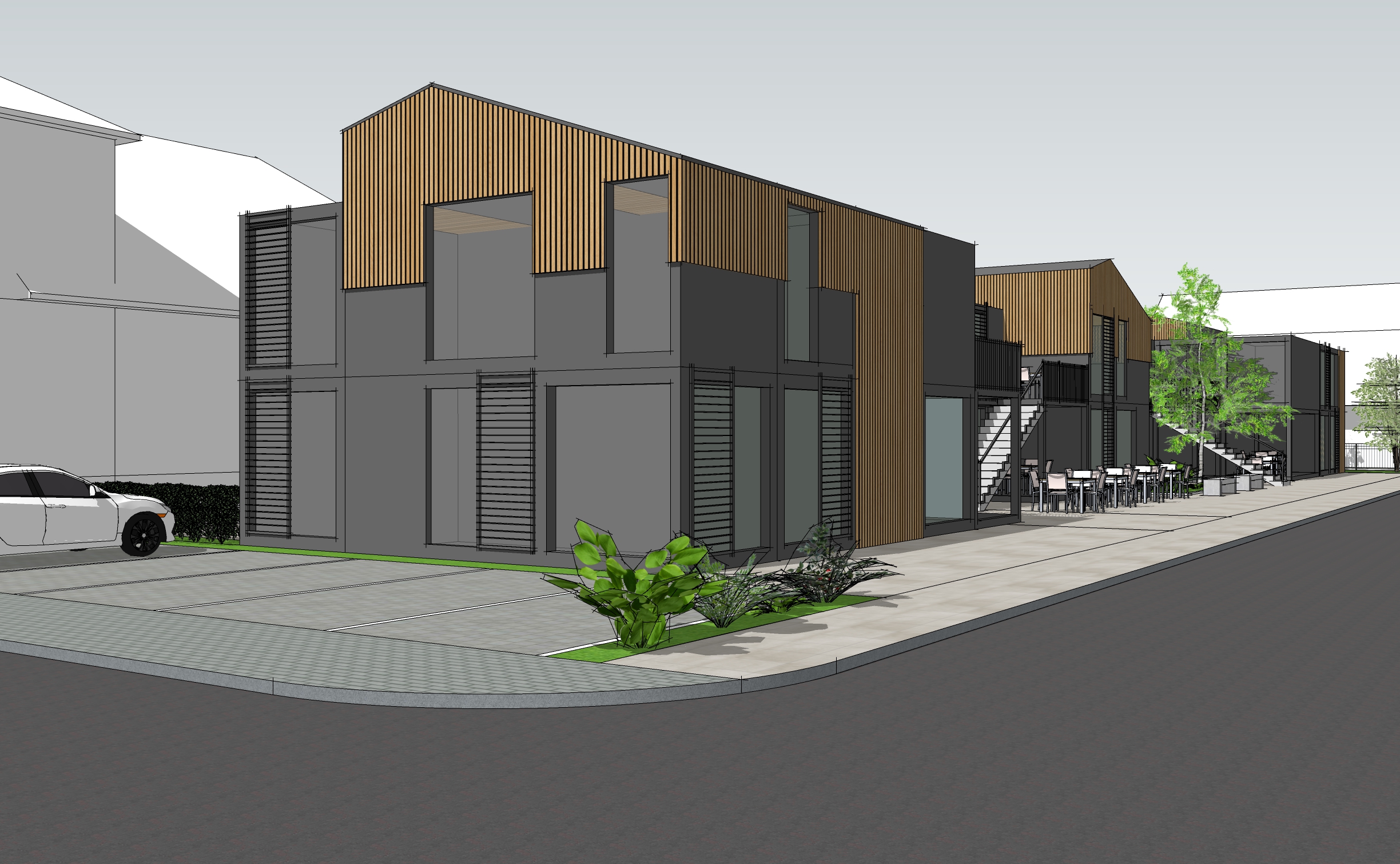 grainy watercolor render of timber frame building with reclaimed wood siding and stone wainscot watercolor trees and urban environment in the background extensive watercolor landscaping surrounding the building