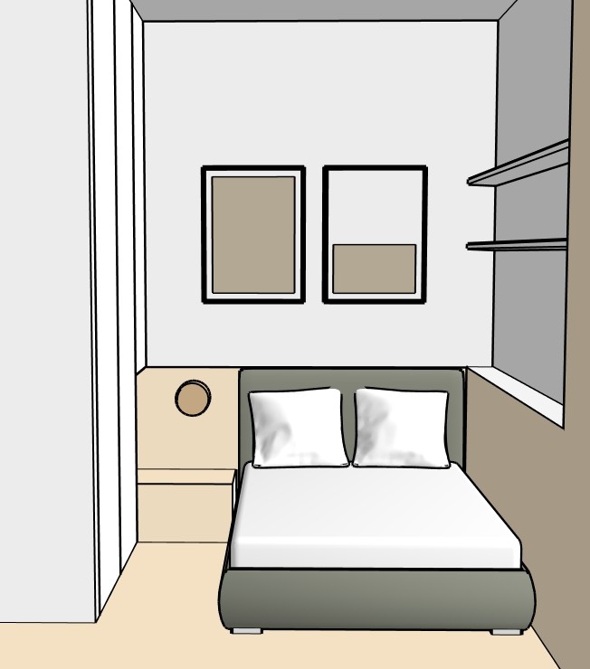 render this bedroom taking into consideration the indirect lighting behind the wooden board that s behind the bed the wall lamp on one side and the french oak parquet make it a cozy atmosphere and add a rug under the bed the beige color in the image should appear as french oak wood in the render and the white color should appear as a subtle light grey taupe don t change the geometry of the room at all you can only change the scone and the side table s shape