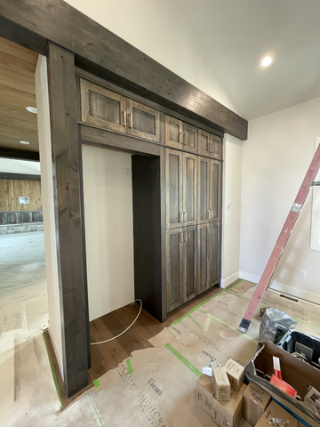 do not change the cabinets in any way preserve the exact cabinet colors materials finishes dimensions door and drawer styles hardware spacing alignment and all geometry exactly as shown do not alter the countertop shape backsplash appliances flooring lighting fixtures or wall structure only remove the construction materials clutter and mess from the scene clean the room and make it look finished and staged add a few simple tasteful home accessories appropriate for the style of the space but do not add or remove any furniture windows or architectural elements maintain the original lighting direction and realism enhance clarity and polish the photo while keeping the cabinetry and room design completely unchanged do not alter the lighting to keep the cabinet colors as they are in the image add new flooring add a subzero built in fridge into the cabinet opening put country artwork on the wall stage the background for a cozy countryside living room