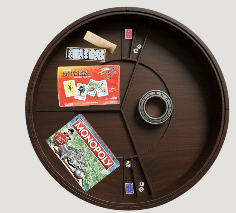 round table birds eye view it has compartments for storing board games the lid that is not shown rotates on a metal ball bearings
