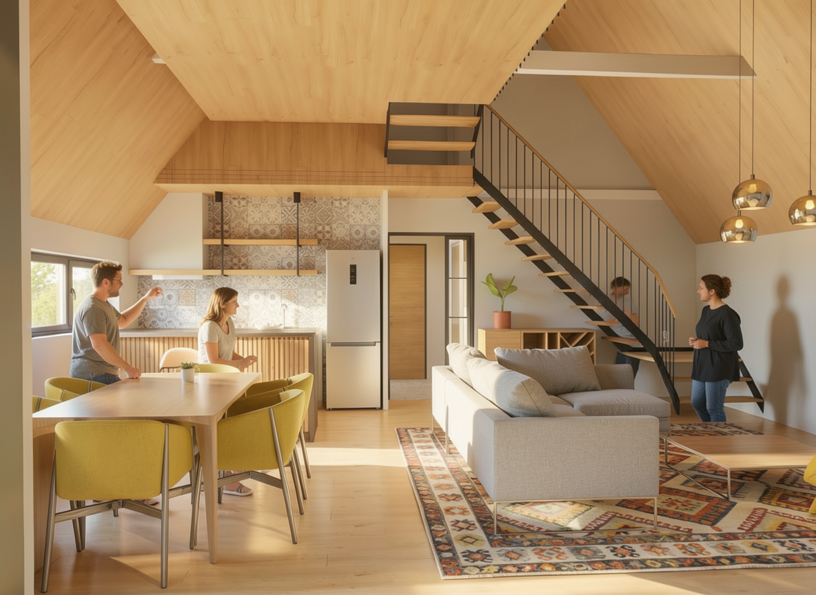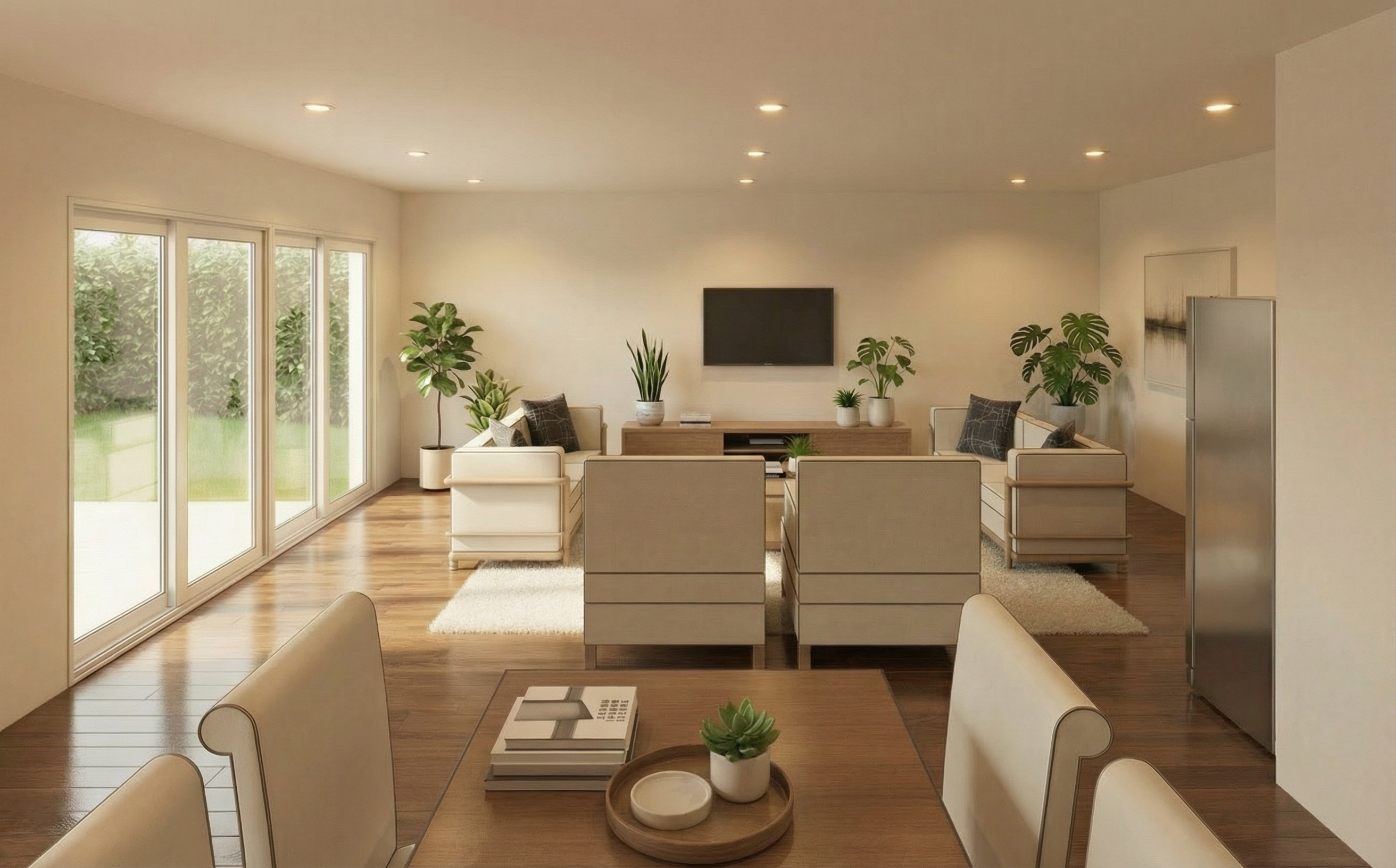 render to make look realistic maintaining the overall structure and properties do not add anything extra to the building white horizontal siding white posts and railing white horizontal boards under the deck red brick skirt white windows rear screened in deck gray metal roof place in a serene private atmosphere with a few surrounding trees simple landscaping and blue sky