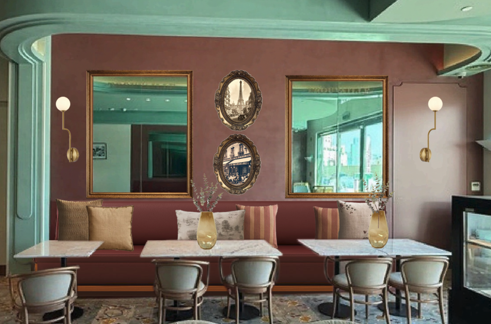 this is photoshopped render i need it to be realistic with a french bistro vibe with a burgundy leather bench