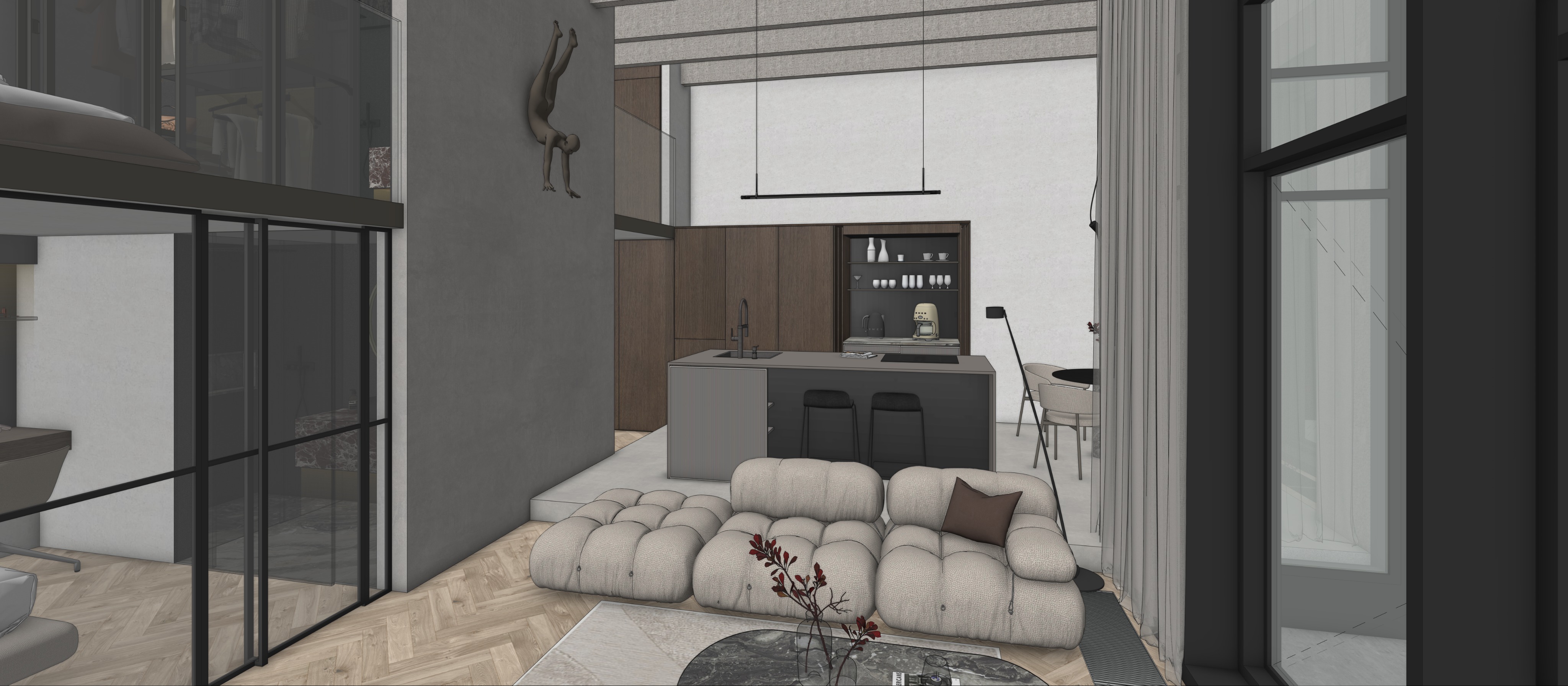 a modern loft interior with an elegant and cozy atmosphere a spacious living area with a beige tufted sofa adorned with a dark brown cushion the floor features a light herringbone pattern in natural wood tones the wall on the left is a smooth gray concrete accented by a bronze wall art sculpture of a diver the kitchen showcases dark wood cabinets with a matte finish contrasted by a sleek black countertop and matching barstools shelves above display minimalist white ceramics large black framed glass windows allow natural light to flood in accompanied by sheer gray drapes on the right the ambient lighting creates a warm inviting glow throughout the space
