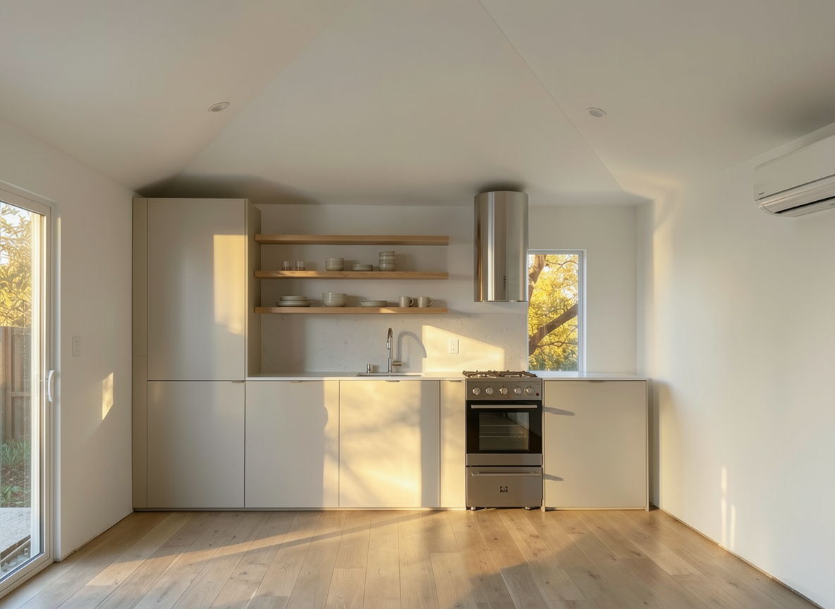 do not change the cabinets in any way preserve the exact cabinet colors materials finishes dimensions door and drawer styles hardware spacing alignment and all geometry exactly as shown do not alter the countertop shape backsplash appliances flooring lighting fixtures or wall structure only remove the construction materials clutter and mess from the scene clean the room and make it look finished and staged add a few simple tasteful home accessories appropriate for the style of the space but do not add or remove any furniture windows or architectural elements maintain the original lighting direction and realism enhance clarity and polish the photo while keeping the cabinetry and room design completely unchanged do not alter the lighting to keep the cabinet colors as they are in the imageremove the paper on the floor add a simple view out the window restage teh countertop for a beautiful kitchen remove the stickers on the window
