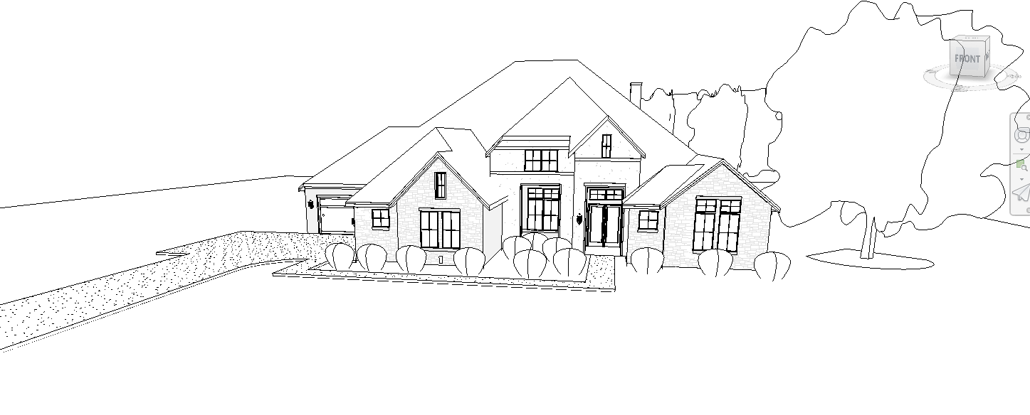 transitional french countryside with austin stone and light stucco black windows and roof landscape with texas native house site sits down slightly from the front view