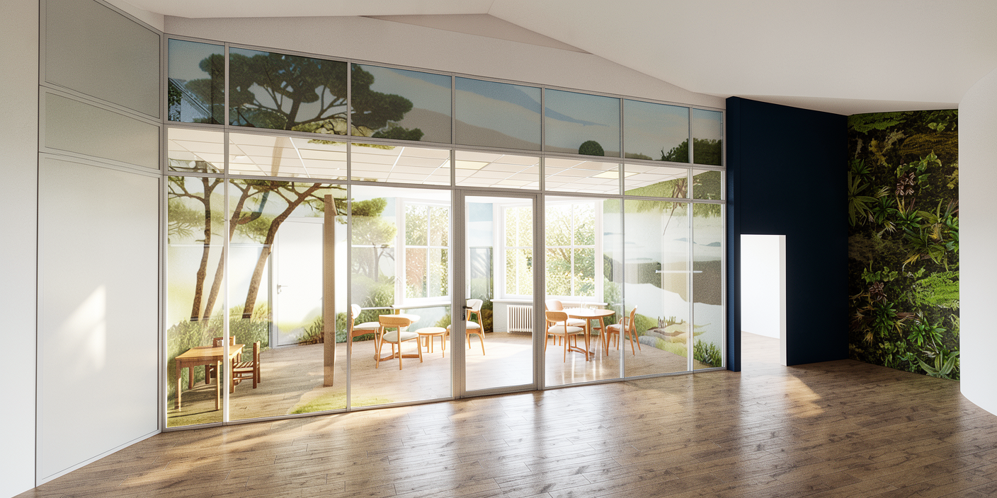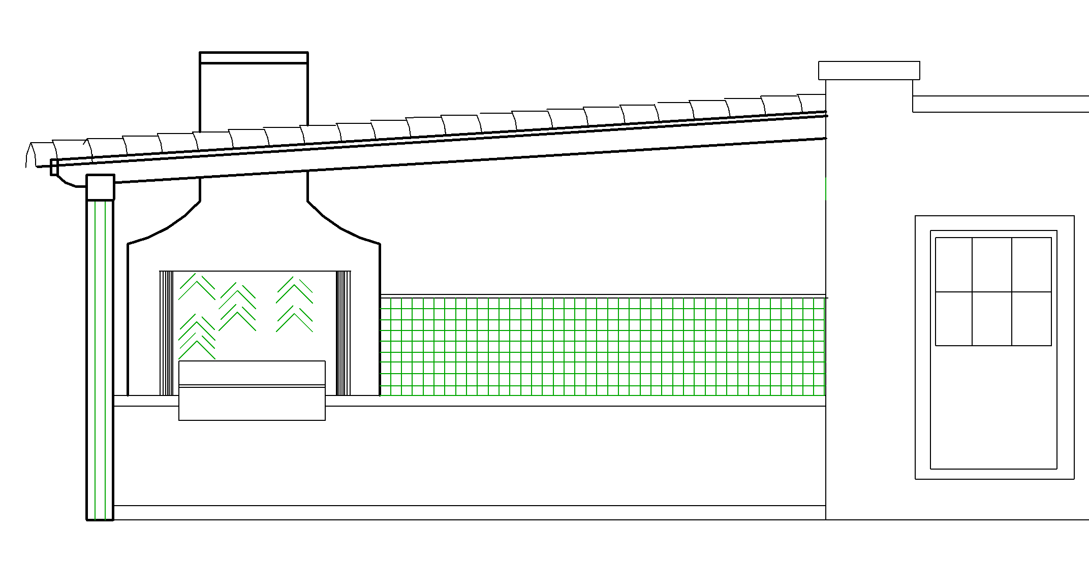 outdoor patio area with rust clay roof with wood framing brick flooring pale stucco house with white windows a grill under a stucco plaster hood zellige tile backsplash travertine countertop tropical plants beyond the covered area is about 25 feet x 25 ft please make it that proportion