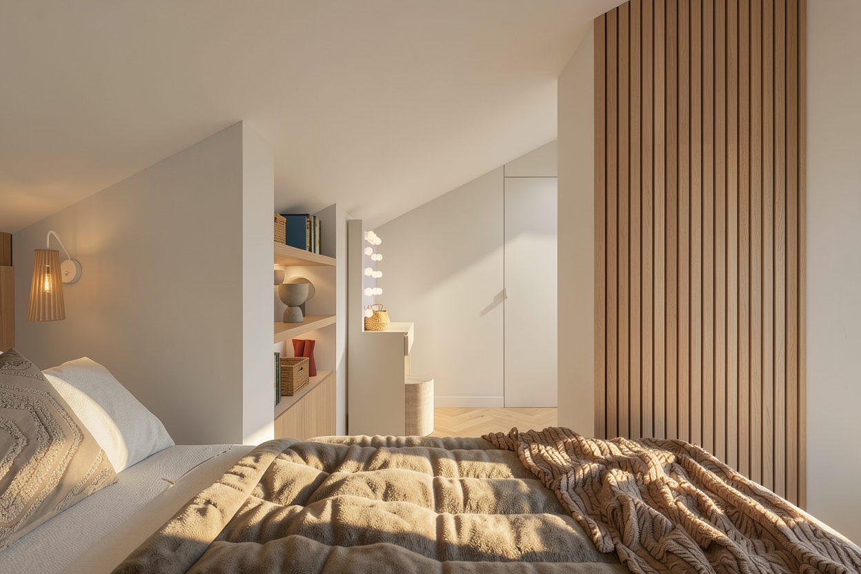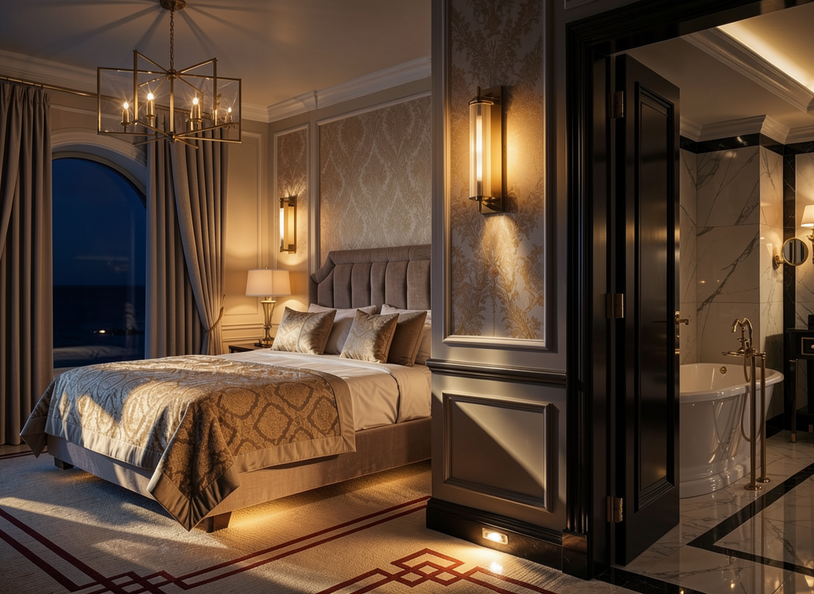 transform this visualization into a highly atmospheric daytime scene emphasizing lighting design and drama preserve all materials textures geometry and furniture exactly enhance natural light entering the space to create rich highlights dynamic shadows and depth across stone walnut champagne velvet and plaster surfaces introduce subtle architectural and decorative lighting where it makes sense wall sconces hidden uplights or accent lamps to create layered illumination focus on interplay of light and shadow reflections and elegant tonal gradients the atmosphere should feel cinematic luxurious and immersive highlighting the textures and forms in a dramatic yet refined way do not change materials or furniture