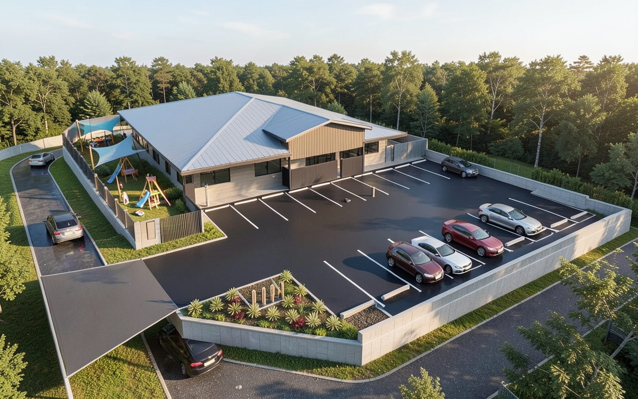 industrial home design tall grass with lighted path on a hill shoreline foreground trees in background dusk soft interior lighting