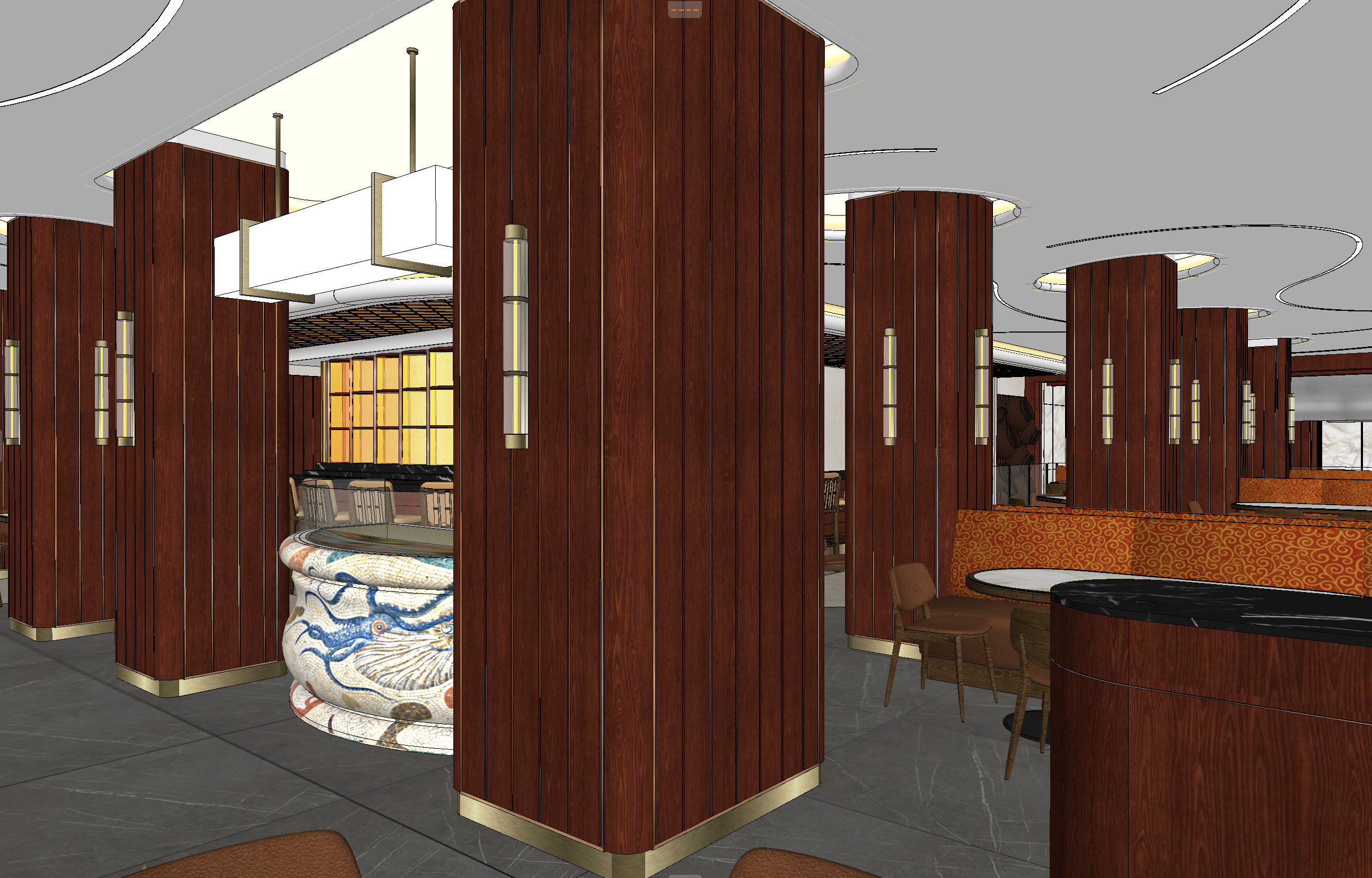 ultra realistic restaurant interior video same camera angle with slow smooth camera motion bright daytime natural light combined with warm 2700k interior glow ceiling features rounded recessed cut outs around each column with curved trim and soft internal lighting mirrored yellow ceiling tiles above the bar area amber glass bar panels black marble countertop palisander wood columns with vertical brass inlays and brass baseboards orange patterned velvet banquettes marble tables caramel leather chairs yellow curtains with cove lighting add lively atmosphere tables fully set with plates glasses napkins a few guests chatting bartenders preparing drinks behind the bar waiters serving subtle curtain movement and reflected light photorealistic elegant vibrant mood