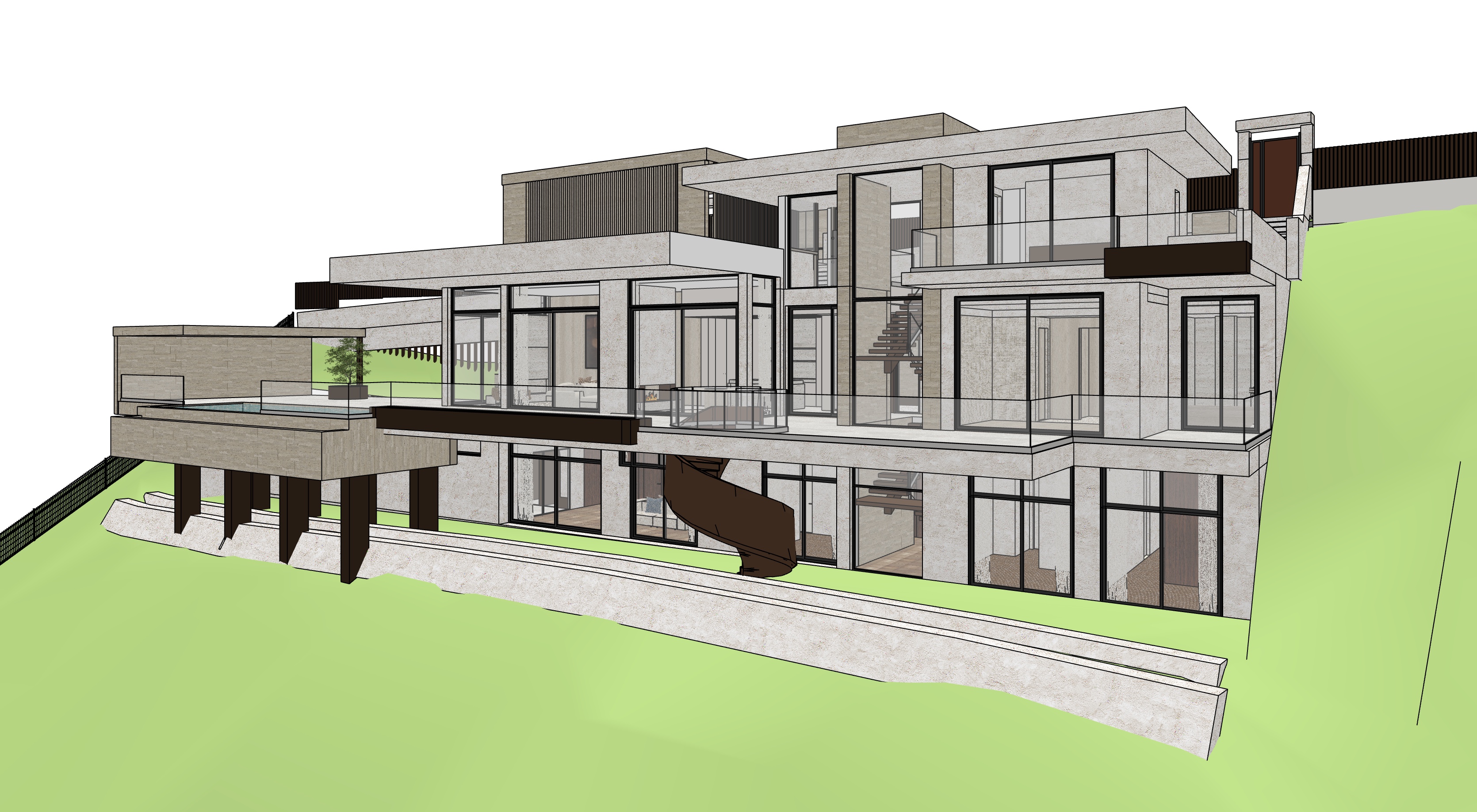 this is a high end mediterranean villa in marbella create a high end architectural exterior realistic render calm and refined atmosphere soft natural daylight neutral warm palette balanced tones no orange cast diffused light with soft shadows subtle contrast natural color accuracy emphasis on materiality and texture tactile surfaces minimal styling clean architectural lines integrated design serene and timeless space depth and layering cinematic softness slightly desaturated tones photorealistic 35mm lens soft color grading quiet luxury emotional balance breathing space no harsh lighting no strong color cast no oversaturation maintain 100 of the geometry materials colours and layout with a sharp photorealistic result add more natural daylight facade rough stucco finish in combination with the darker accent open pore travertine tiles but in a natural colour the darker details is dark bronze finish plated steel add a great outdoor scene with green and palm trees on the hill as the 3d model is sculpted add some more life to the scene