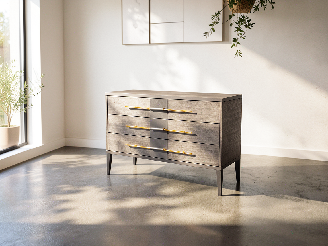 ingresso abitazione sopra alla consolle c uno specchio tondo la base della lampada da tavolo in pietra chiara non ci sono strip led i faretti cilindrici a soffitto sono accesi dalla finestra entra della luce naturale fuori metti degli alberi con un panorama di campagna le arcate sono in pietra