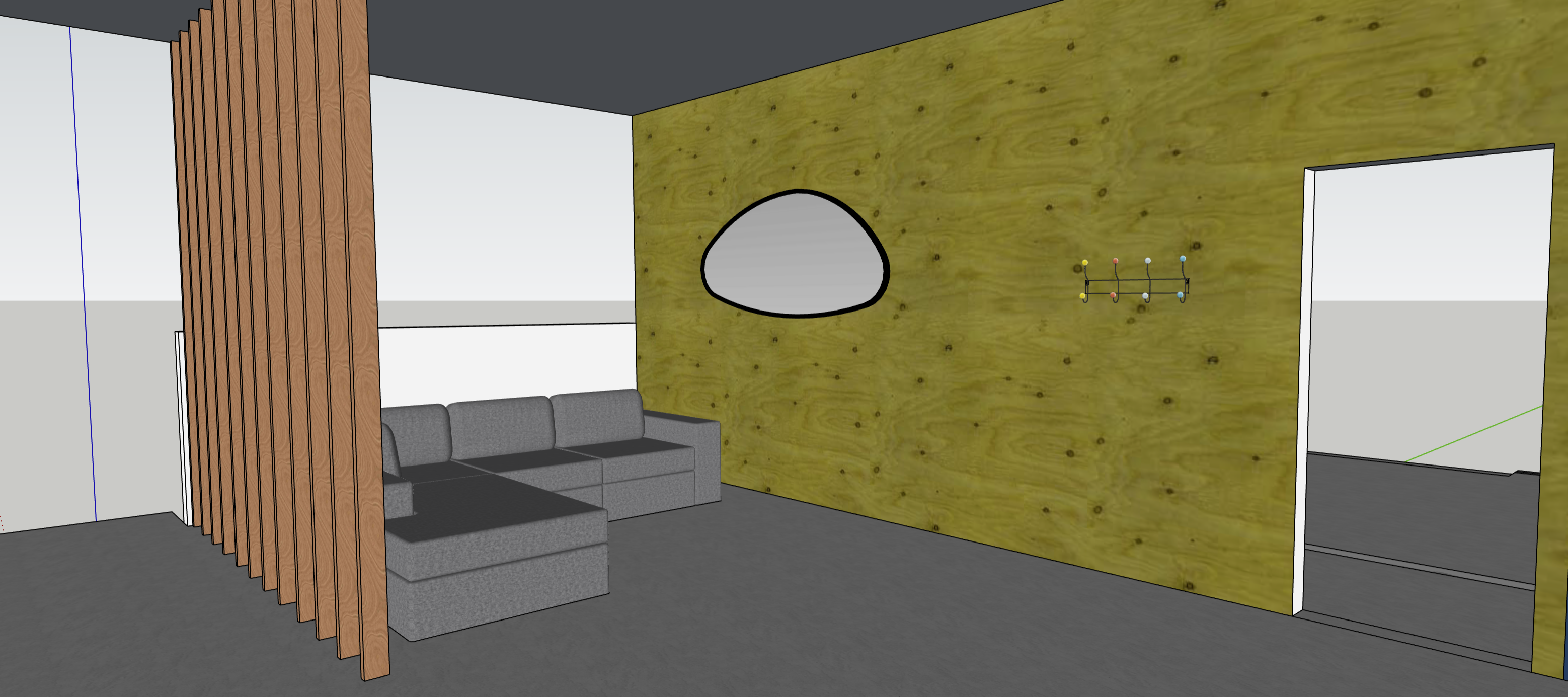 use the reference image for the right wall finish add a pony wall behind the couch and show windows in the background the room to the right should show a conference table make the sofa a dark blue make this photo realistic and add a small coffee table