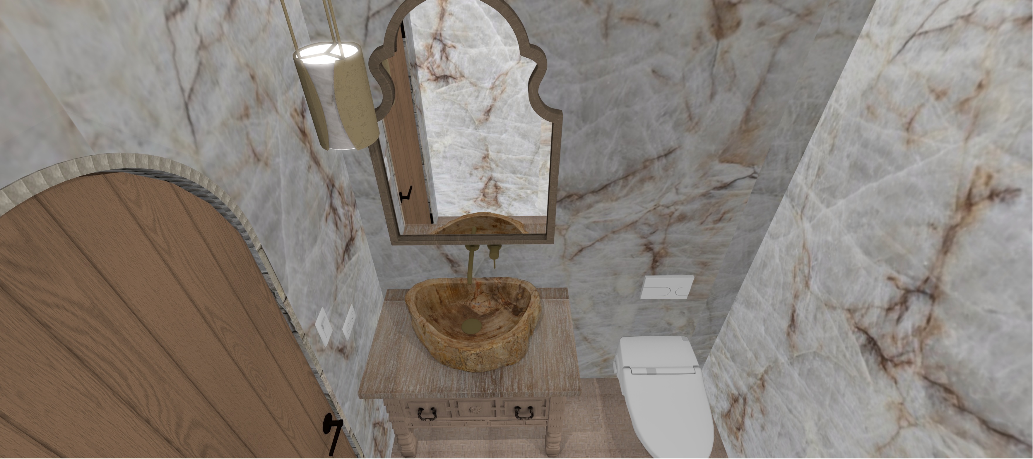 create a more realistic rendering of powder bath maintain same colors finishes fixtures and furniture