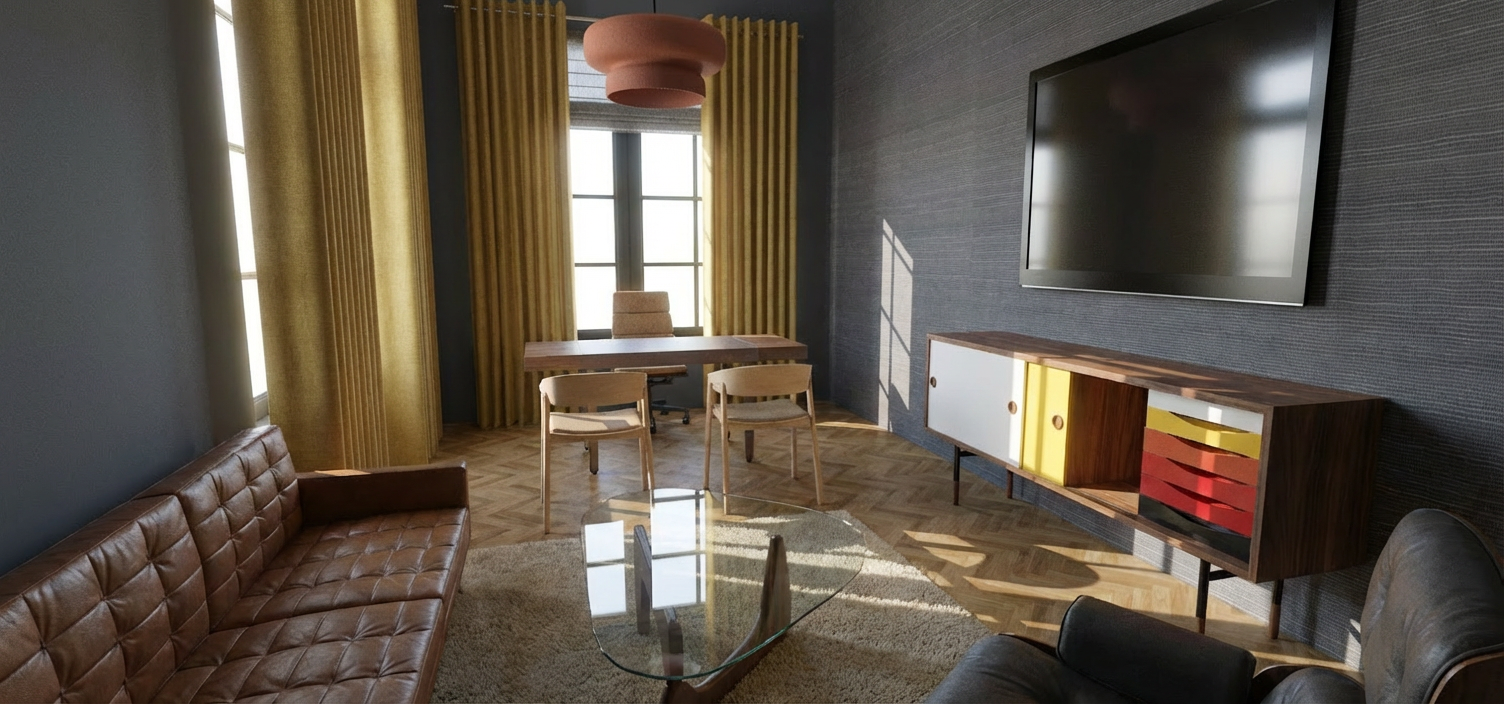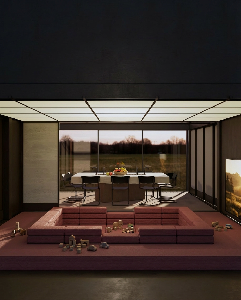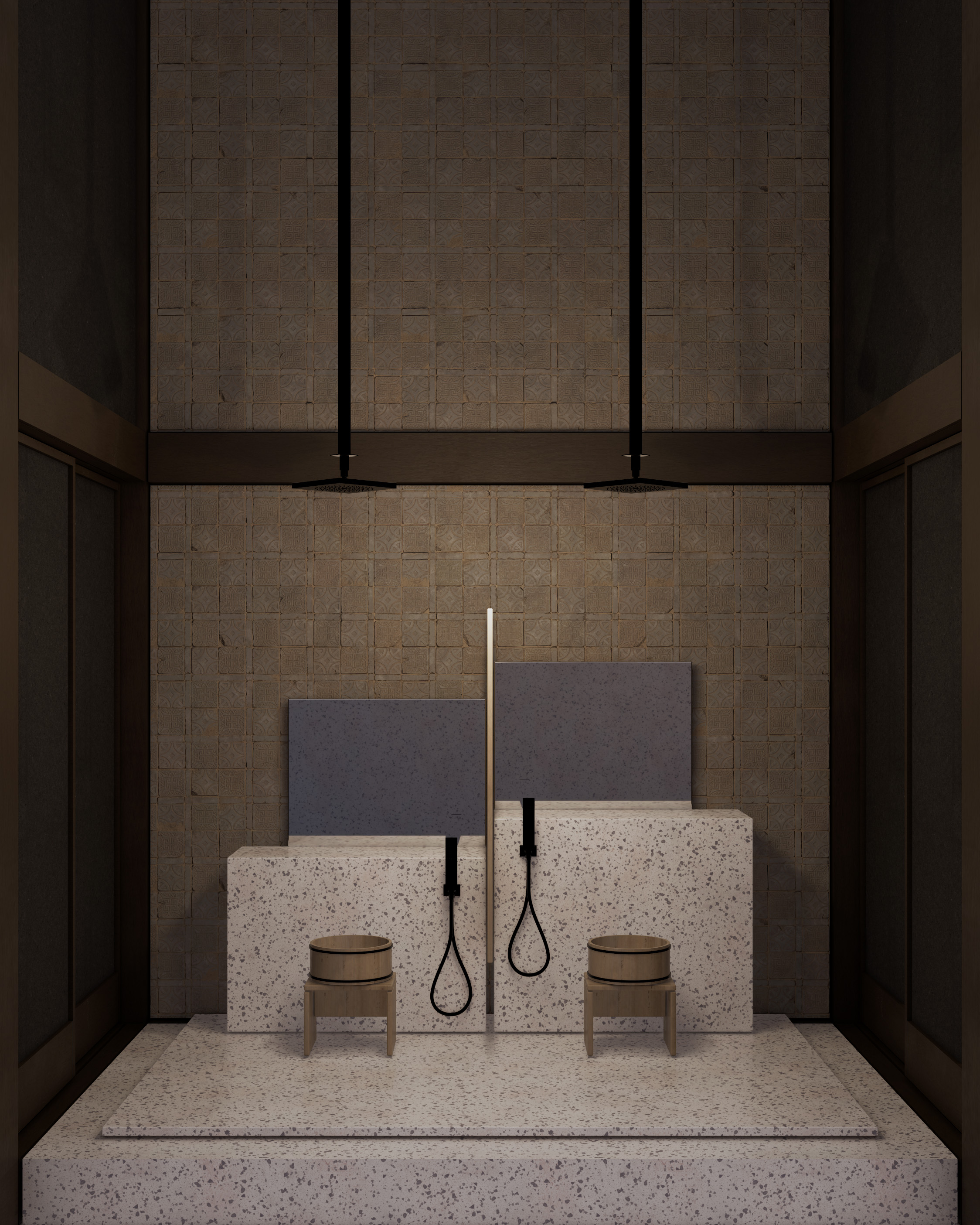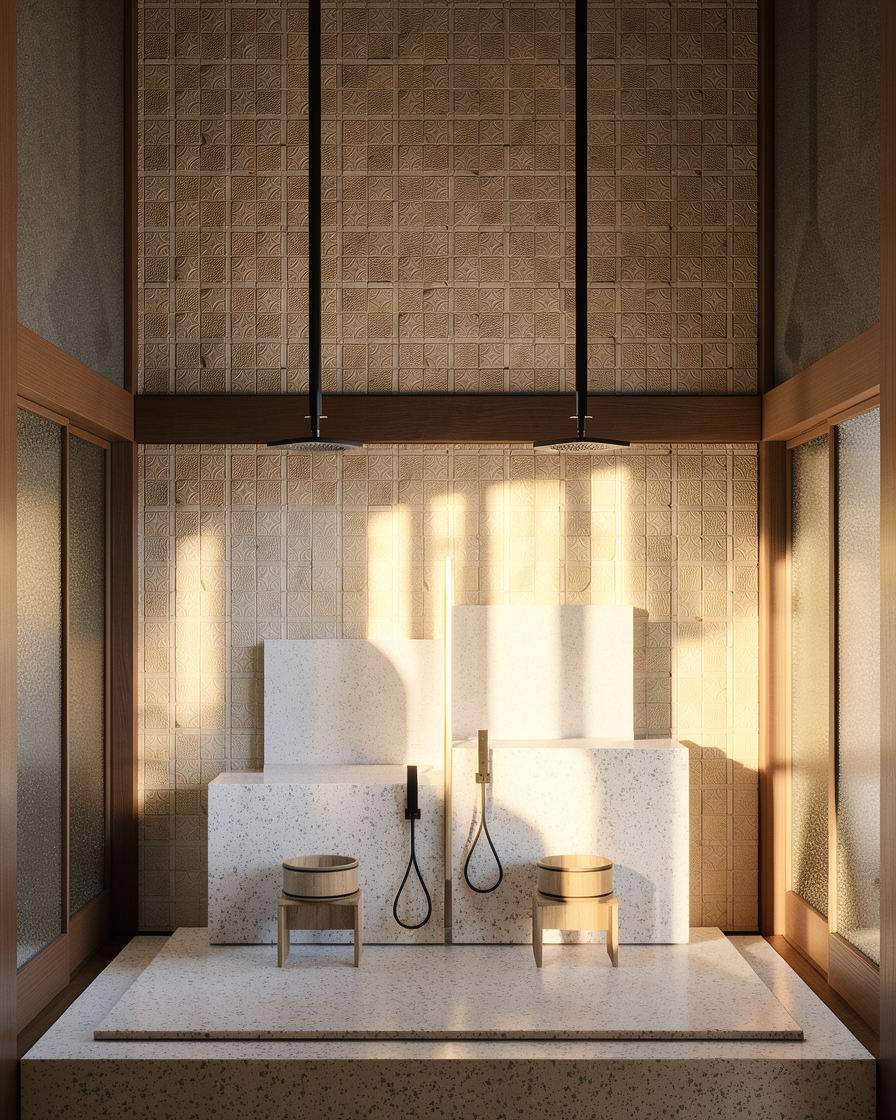 render a luxurious modern bathroom with a serene atmosphere the walls are adorned with textured earthy brown tiles creating a warm and inviting ambiance the terrazzo surfaces are speckled with light and dark grays complementing the subtle elegance of the design two mirrors in the center black paper sliding doors on the sides the showerheads and fixtures are sleek and matte black enhancing the minimalist aesthetic place two contemporary light wooden stools symmetrically adding a touch of natural elegance the lighting is soft casting gentle shadows that emphasize the room s refined textures and materials