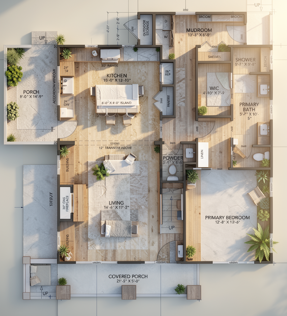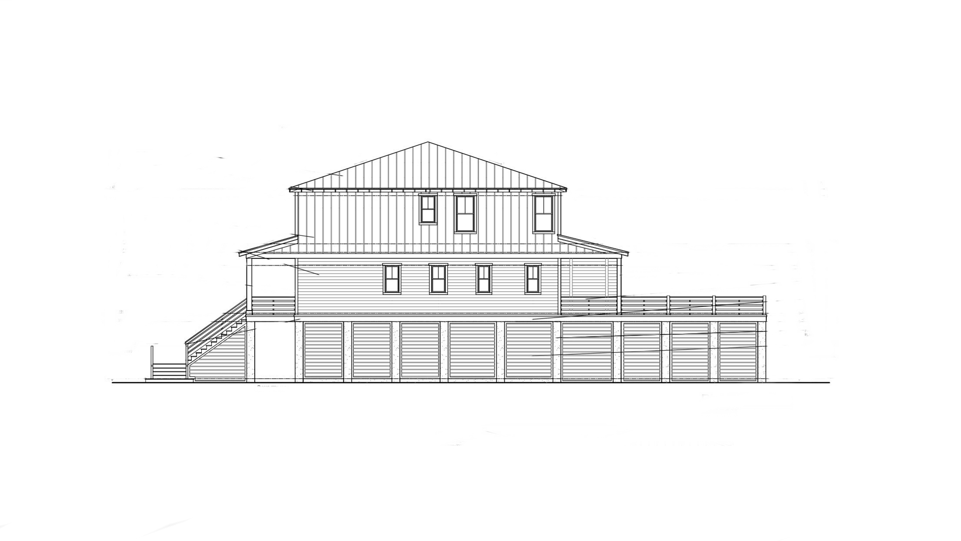 the house should be white with a silver metal roof and palm trees should be placed so that they do not overly block the view make a driveway for the garage do not add anything else just render like the sketch
