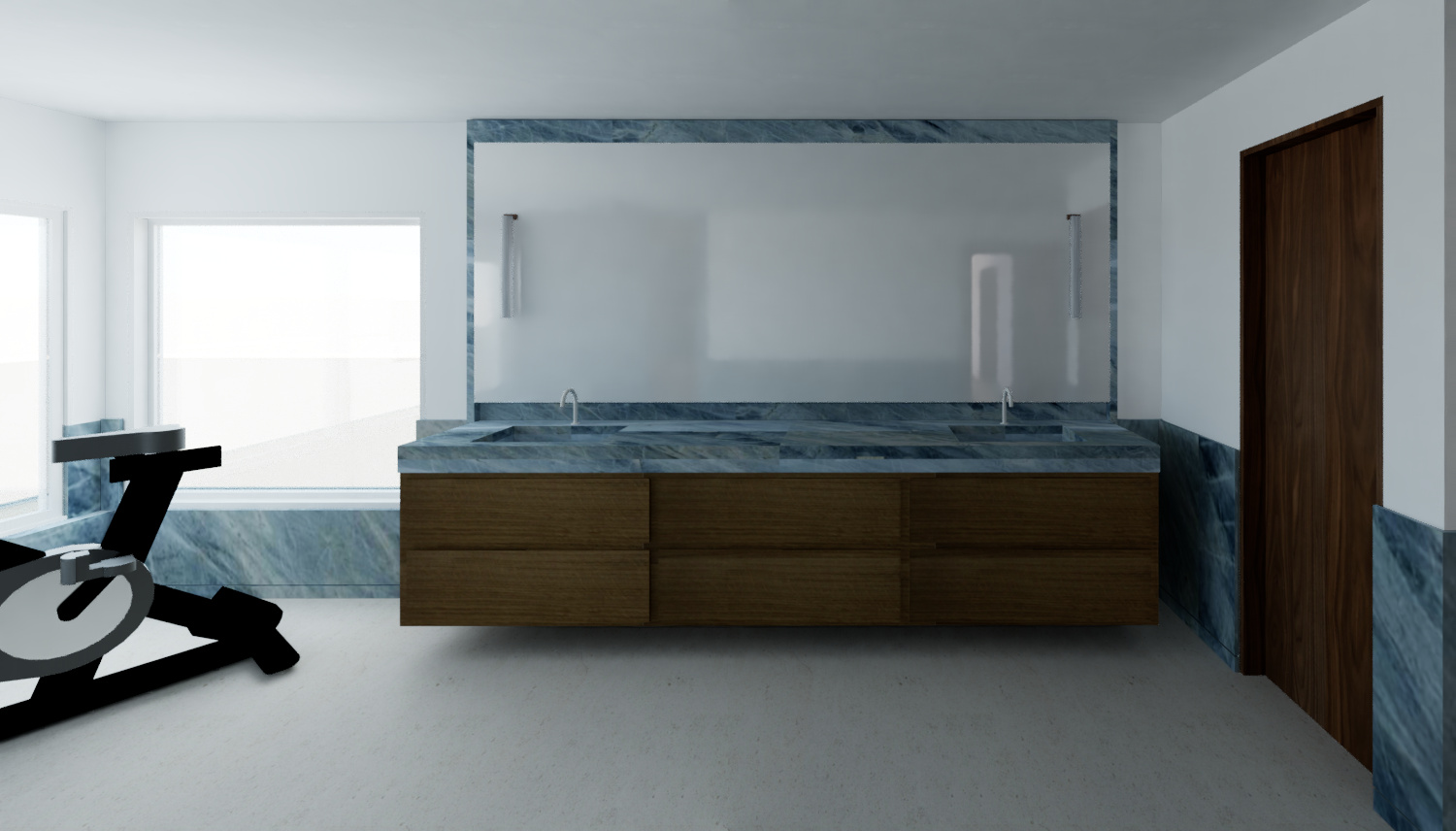 a classic modrn bathroom with white limestone floors gray blue marble wainscotting walnut wood accents and soft ambient lighting there is an ocean view from the windows