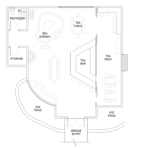 photorealistic interior rendering of a contemporary japanese tea house natsukashii tea view from bridge entry crossing koi ponds into serene tea hall central angular tea bar island with wood slat cladding bonsai zen garden on left communal tea table in back raised tatami tea deck seating on right shoji screens glass walls to koi pond gardens cherry blossoms outside cedar wood ceilings with slats stone and wood floors bonsai trees moss ceramic tea sets warm ambient lighting tranquil japanese courtyard wabi sabi minimalism luxury hospitality design ultra realistic architectural rendering ar 16 9 v 6 style raw