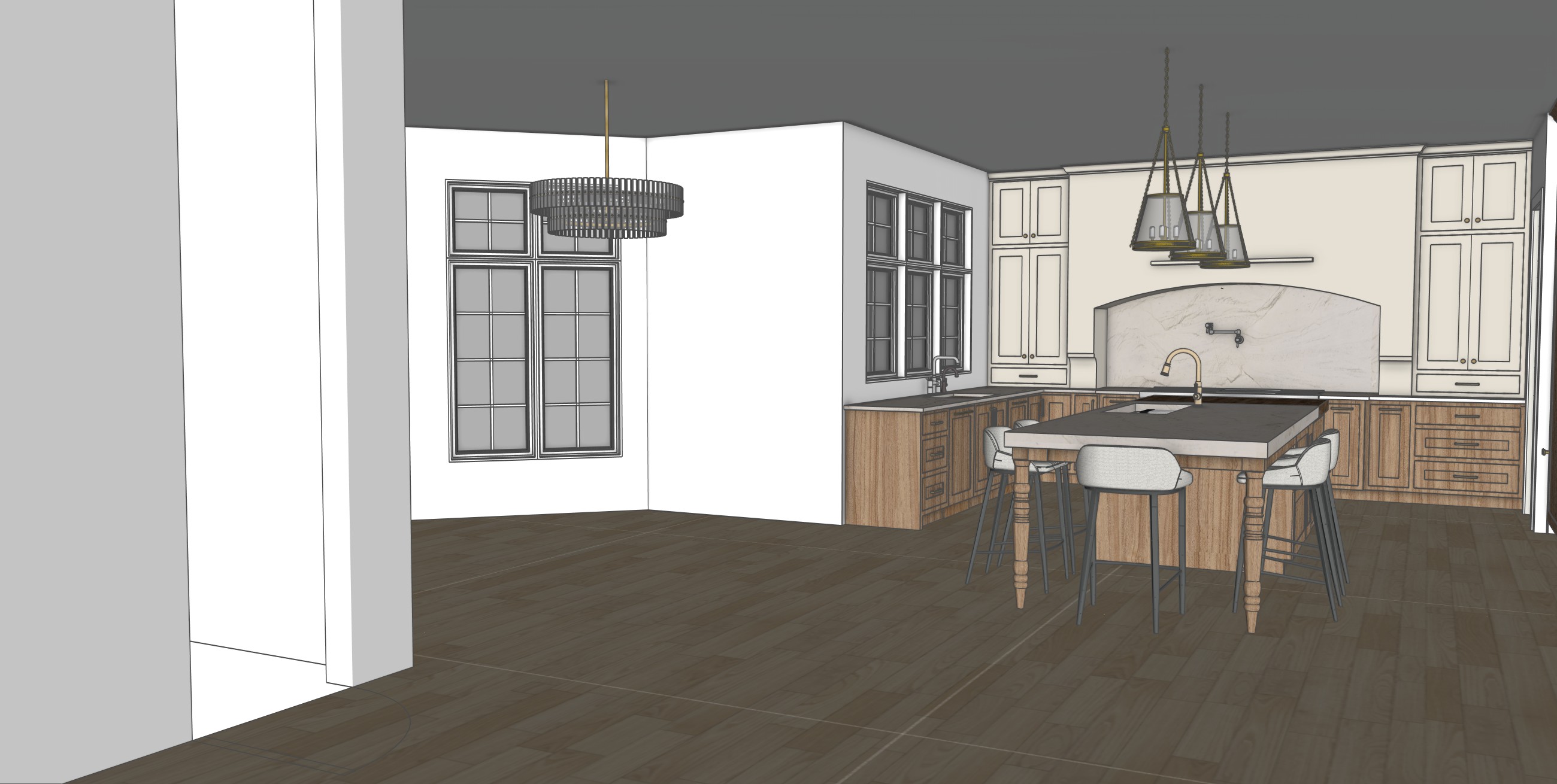 ultra realistic kitchen rendering based on a sketchup model realistic cabinetry materials soft beige painted range hood and hutches crystallo quartzite countertops with subtle veining accurate texture scale white oak floors with subtle wear and color variation matte painted walls with slight texture realistic fabric upholstery with visible weave physically accurate reflections and shadows soft indirect light global illumination professional interior photography crisp edges high detail clean modern aesthetic full frame camera 28mm lens