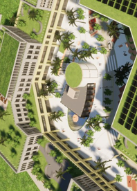 outdoor view shopping center sand stone facade palm trees green roof architecture