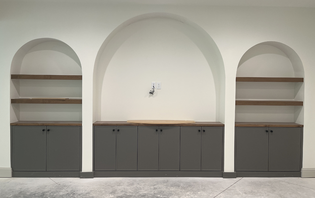 do not change the cabinets in any way preserve the exact cabinet colors materials finishes dimensions door and drawer styles hardware spacing alignment and all geometry exactly as shown do not alter the countertop shape backsplash appliances flooring lighting fixtures or wall structure only remove the construction materials clutter and mess from the scene clean the room and make it look finished and staged add a few simple tasteful home accessories appropriate for the style of the space but do not add or remove any furniture windows or architectural elements maintain the original lighting direction and realism enhance clarity and polish the photo while keeping the cabinetry and room design completely unchanged do not alter the lighting to keep the cabinet colors as they are in the image add a tv with a simple screen saver in the middle arch remove the cardboard on the wood top restage the floating shelves for a simplistic modern living room