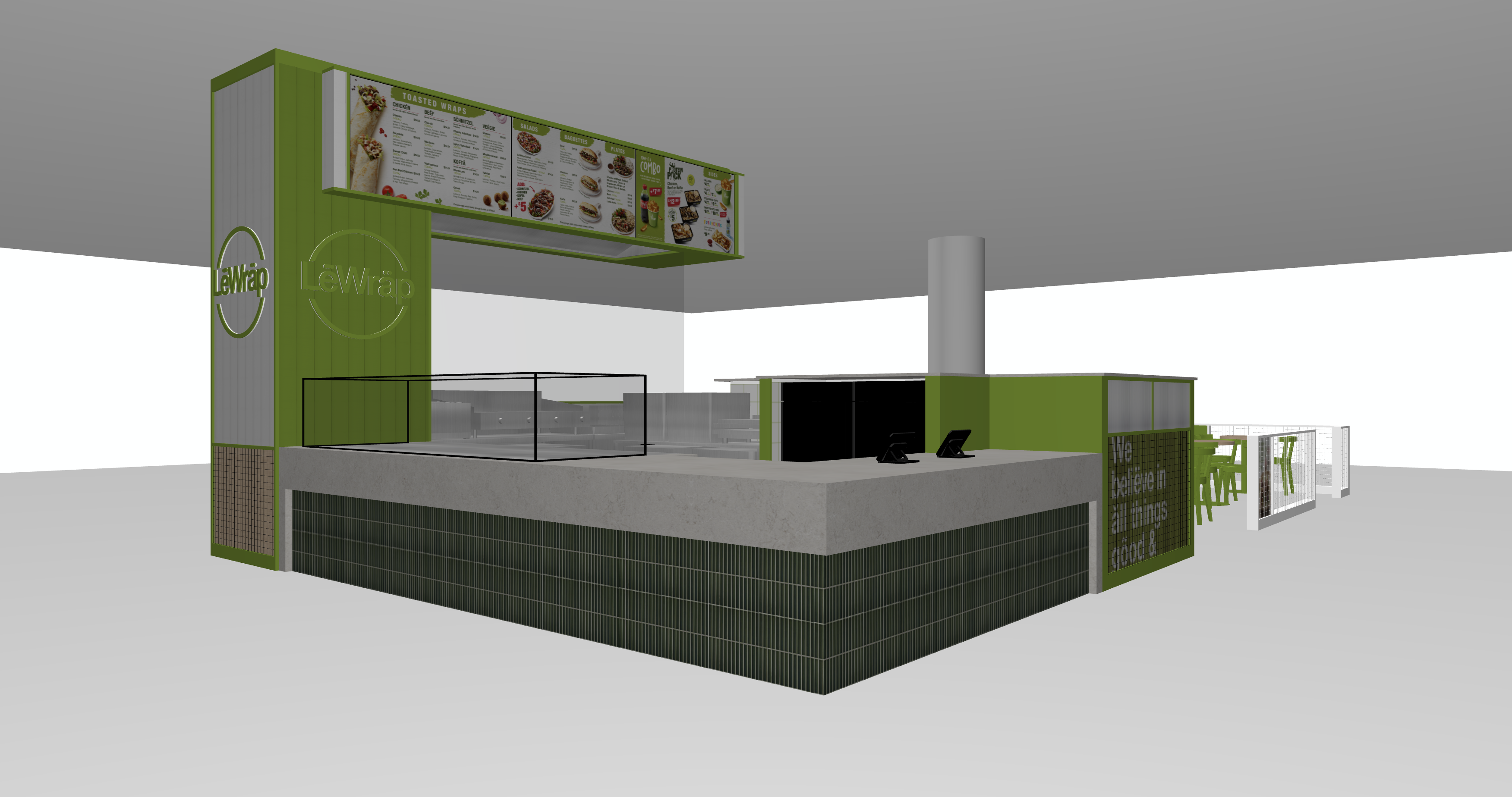 make the lewrap signage illuminate add a led light to the underside of the stone so it has a warm light along the green tiles keep the same materials just make it realistic