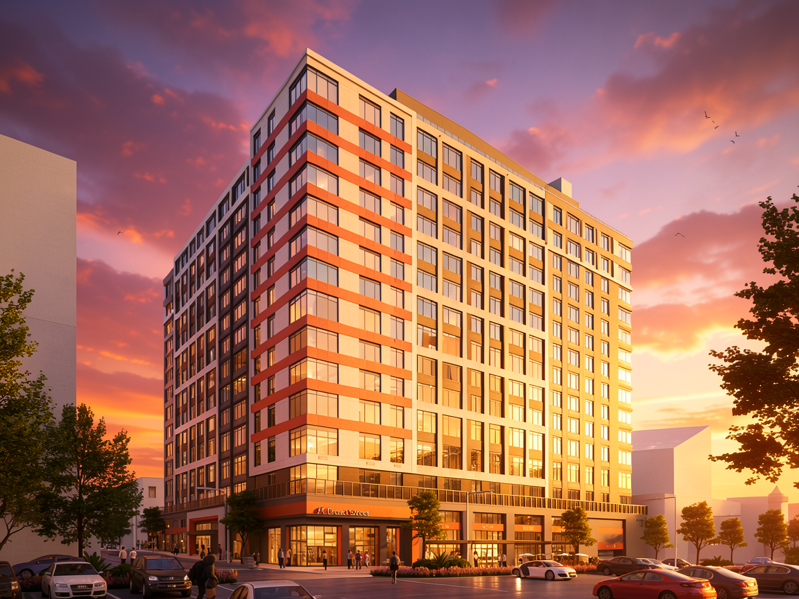 this view is facing north please render at sunset with sunset to the west