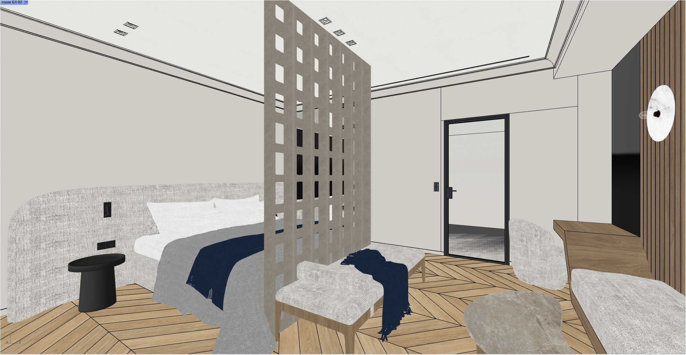 create a realistic high resollution materials image switch on lights do not redesign the geometries or styles at the back in the middle there is a metal black door with glass that enters to wc