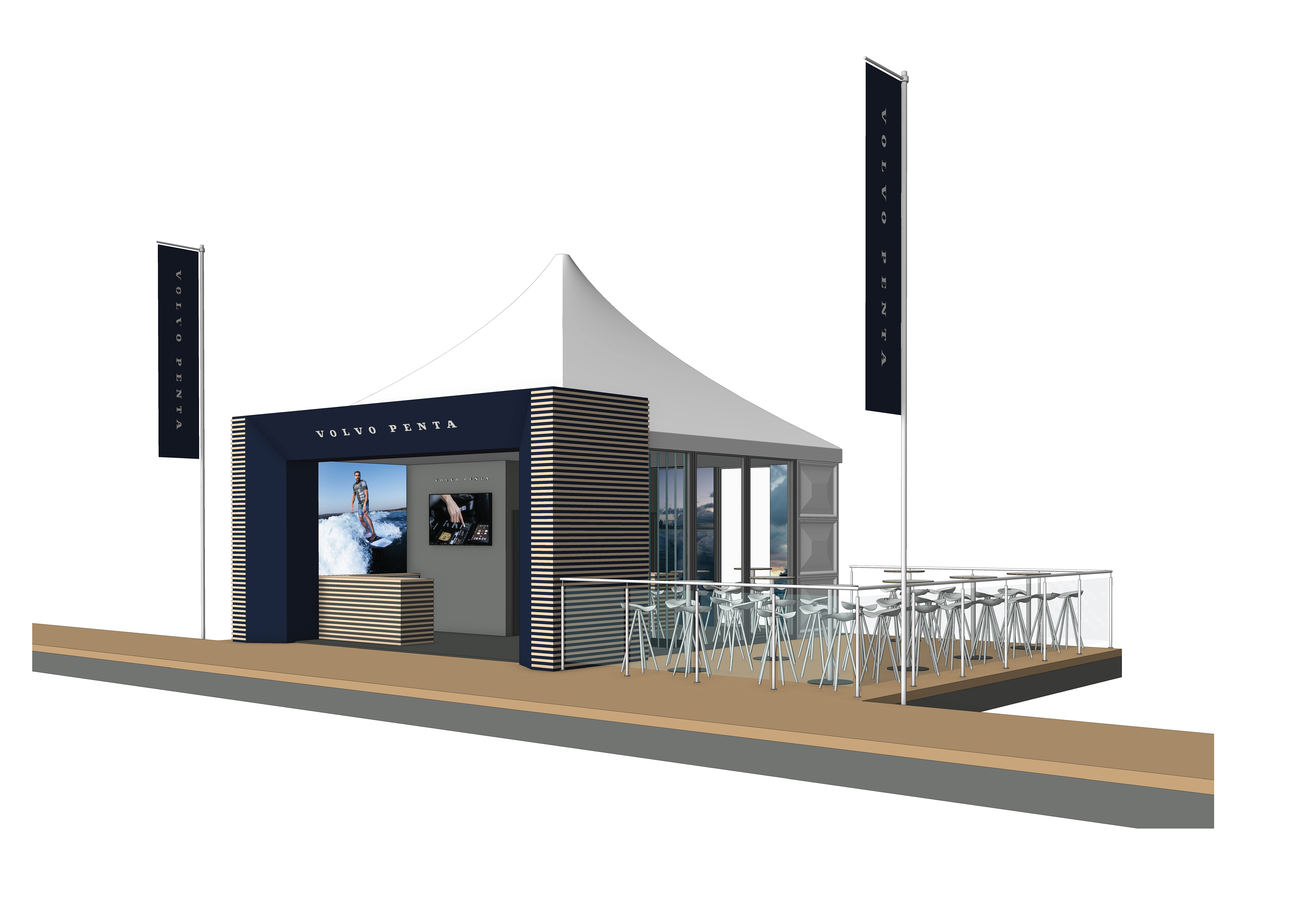 a structure built on a timber decked pontoon in a marina with two tall flags
